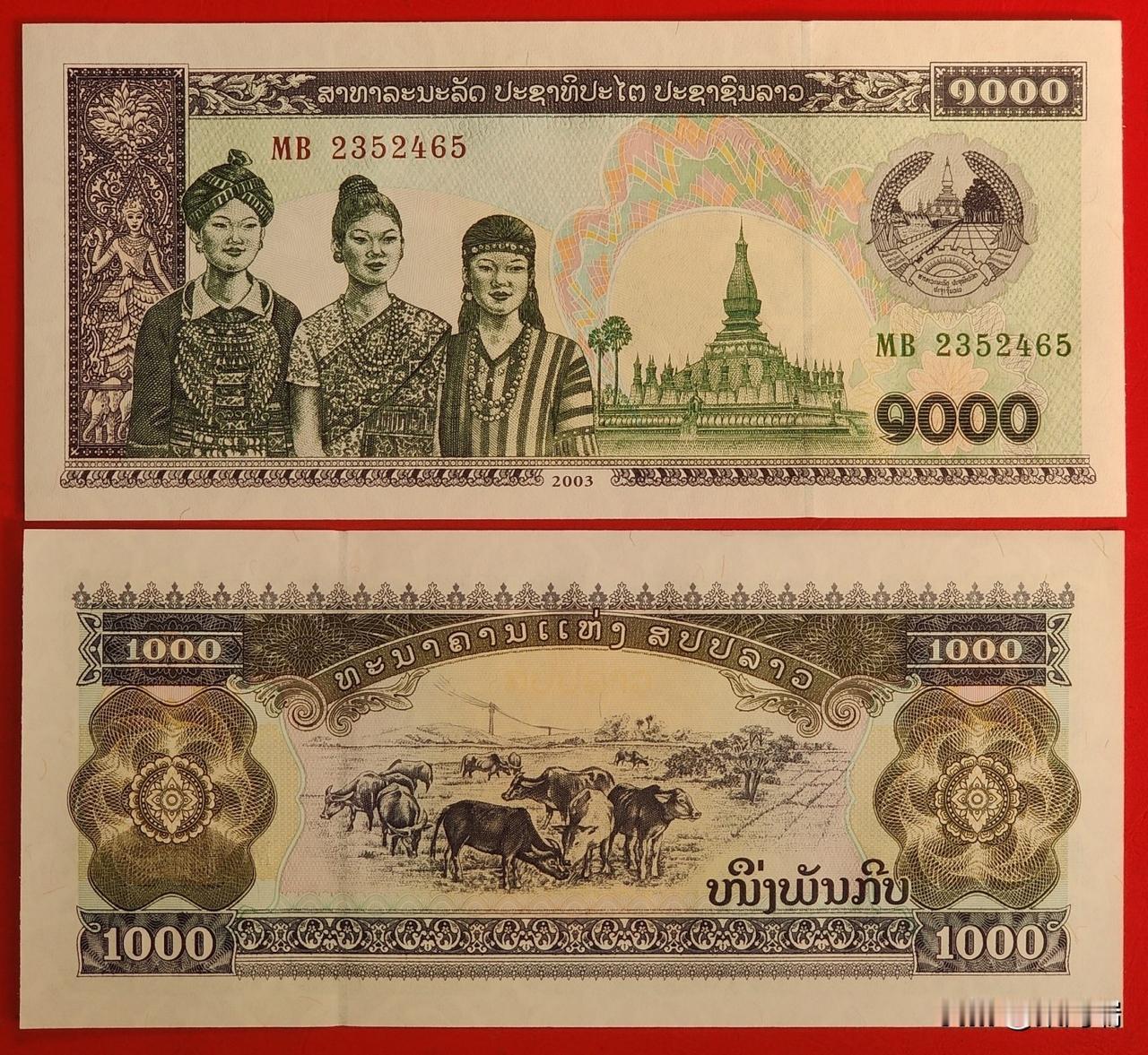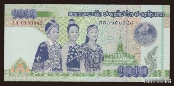 2008年版老挝1000基普纸币,因侵犯肖像权而被大量回收销毁。 该纸币面额为1000基普,发行年份为2008年。 这张纸币因其正面的三名女性形象是基于真实人物照片而非艺术原型绘制,涉及肖像权纠纷,老挝央行在发行后不久即停止发行并大量回收销毁。 由于回收销毁,目前仅少量纸币留存于收藏市场,成为收藏品。 2020年版(最新确认版): 这是目前流通中较新的版本,票面日期印有 2020 字样。此版本在 2024 年初得到进一步确认,主要在防伪特征或生产年份上进行了微调。其正面图案仍保持老挝三大民族妇女形象和塔銮(Wat That Luang)。