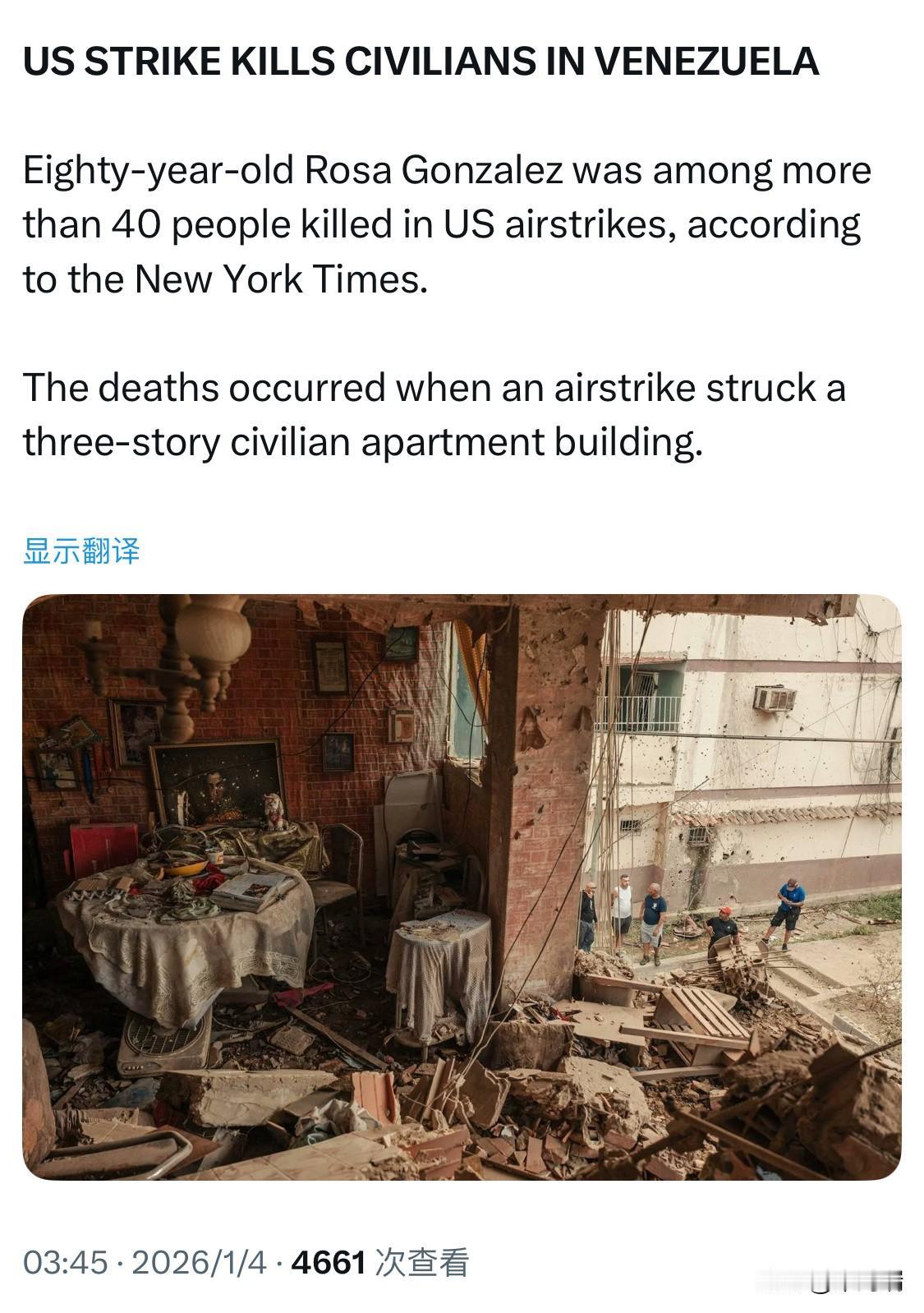 美国空袭造成委内瑞拉平民死亡 据《纽约时报》报道,80岁的罗莎·冈萨雷斯是美军空袭中丧生的40多人之一。 空袭击中一栋三层高的民用公寓楼时造成人员伤亡。
