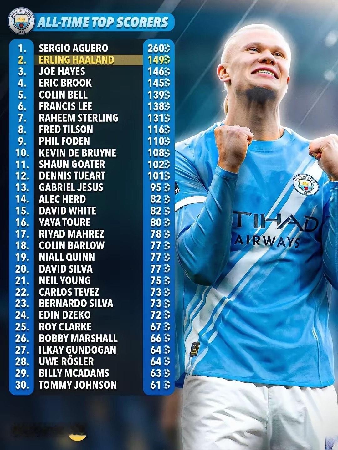 曼城历史射手榜更新!哈兰德直冲第二,这速度真的正常吗?曼城队史射手榜同样摊开来看,但画风和隔壁红魔完全不一样。如果说曼联是“百年慢炖”,那曼城更像是“近代猛火”。榜首依旧是阿圭罗的 260 球,高高在上,而真正让人头皮发麻的,是那个已经冲到第二位的名字以下为曼城历史射手榜完整排名(按进球数)1、塞尔吉奥·阿圭罗260球2、埃尔林·哈兰德149球现役|仍在疯狂上涨中3、乔·海耶斯146球4、埃里克·布鲁克145球5、科林·贝尔139球6、弗朗西斯·李138球7、拉希姆·斯特林131球8、弗雷德·蒂尔森116球9、菲尔·福登110球10、凯文·德布劳内108球11、肖恩·戈特尔102球12、丹尼斯·图尔特101球13、加布里埃尔·热苏斯95球14、亚历克·赫德82球15、大卫·怀特82球16、亚亚·图雷80球17、里亚德·马赫雷斯78球18、科林·巴洛77球19、尼尔·奎因77球20、大卫·席尔瓦77球21、尼尔·杨75球22、卡洛斯·特维斯73球23、贝尔纳多·席尔瓦73球24、埃丁·哲科72球25、罗伊·克拉克67球26、博比·马歇尔66球27、京多安64球28、乌韦·勒斯勒64球29、比利·麦卡当斯63球30、汤米·约翰逊61球真正夸张的只有这一行:哈兰德,149 球,队史第二,而且还没刹车。加盟时间不长,却已经把一堆传奇甩在身后,甚至连“追阿圭罗”这种原本听着很离谱的话,现在都变得有点现实了问题来了:以哈兰德目前的效率,他超越阿圭罗成为曼城队史第一射手,只是时间问题吗?还是说,这个纪录会成为英超史上最没悬念的一次登顶?