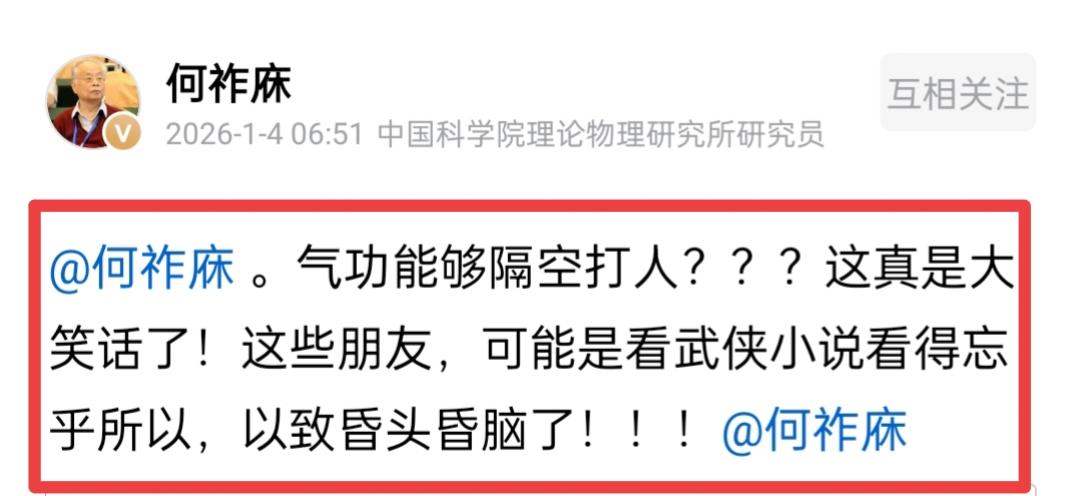 何祚庥老院士对气功的描述相当准确。1月4日,何老院士发文指出,气功中并不存在“隔空打人”的说法,这不过是有些人武侠小说看多了,以致于昏头昏脑了。 何老院士的这一表述十分正确。所谓“隔空打人”,其实都是电视剧里的场景:通常在剧中,大侠修炼某种神功后,一掌打出便能隔空打倒数十人。 从现实角度来看,这样的场面绝无可能发生,它是对气功作用的过度夸张。气功用于强身健体或许还有一定道理,但要说能“隔空伤人”,那大概率就是无稽之谈了。
