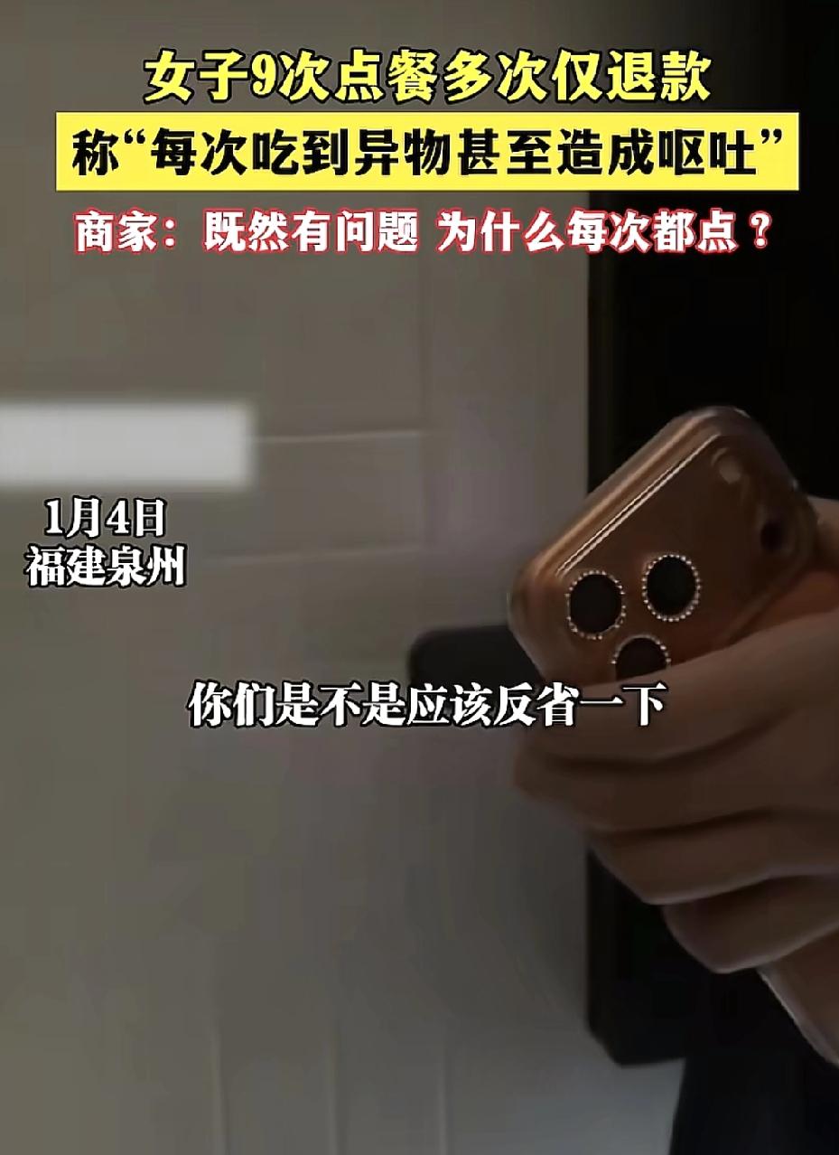 福建泉州一女子点外卖连续9次。都选择仅退款,商家找上门的时候,女子辩称自己每一次吃到产品都发现有异物,甚至要吐。商家不理解,为什么每次吃到有问题,还要点了那么多次。网友们觉得女子就是想白嫖外卖,更有网友提出,这些顾客每次点外卖都仅退款,平台应该有监管的责任。