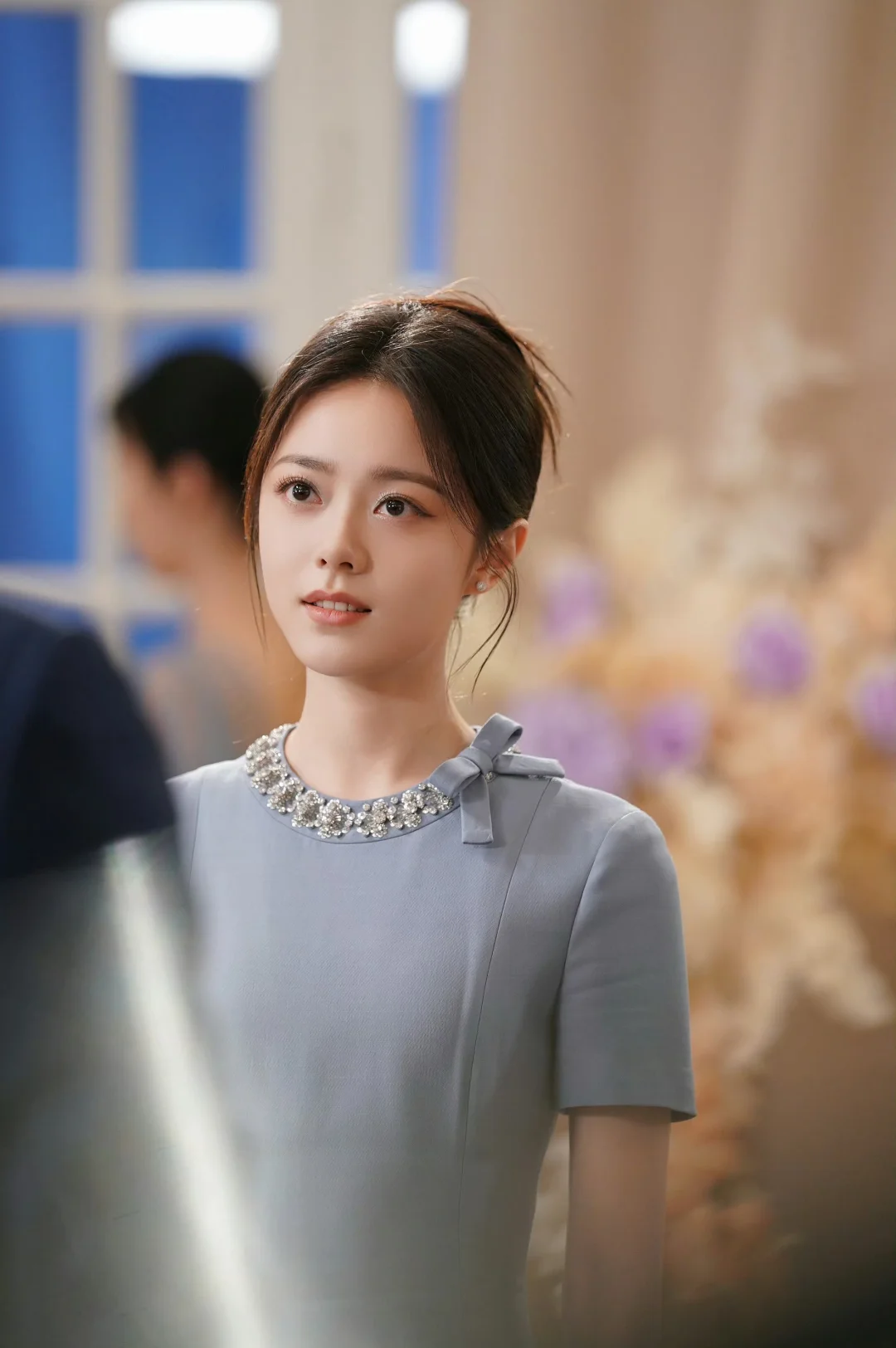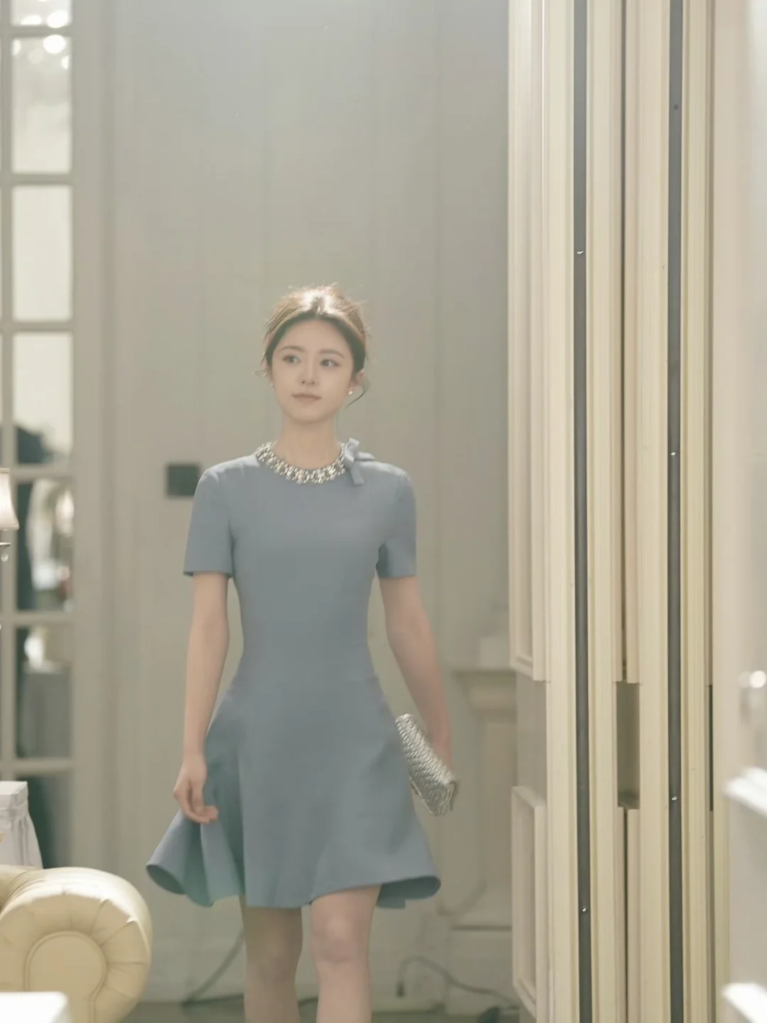 优雅东方韵,浅蓝上衣配米色长裤,漫步古风庭院,尽显时尚与古典的完美融合。