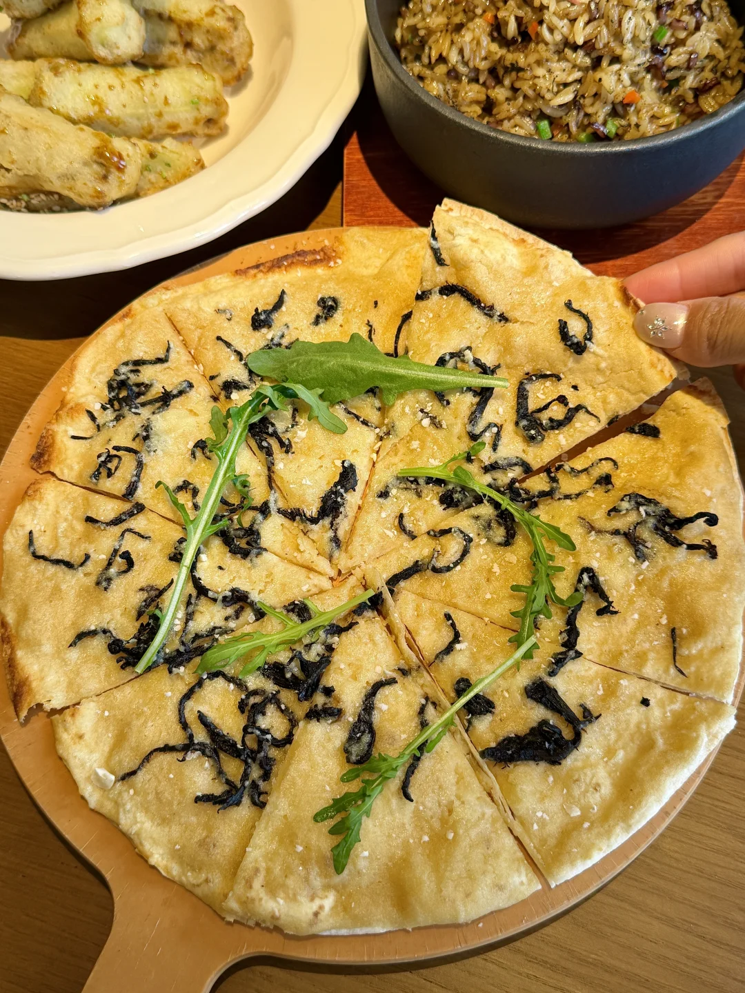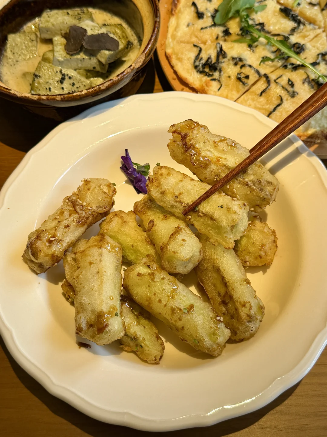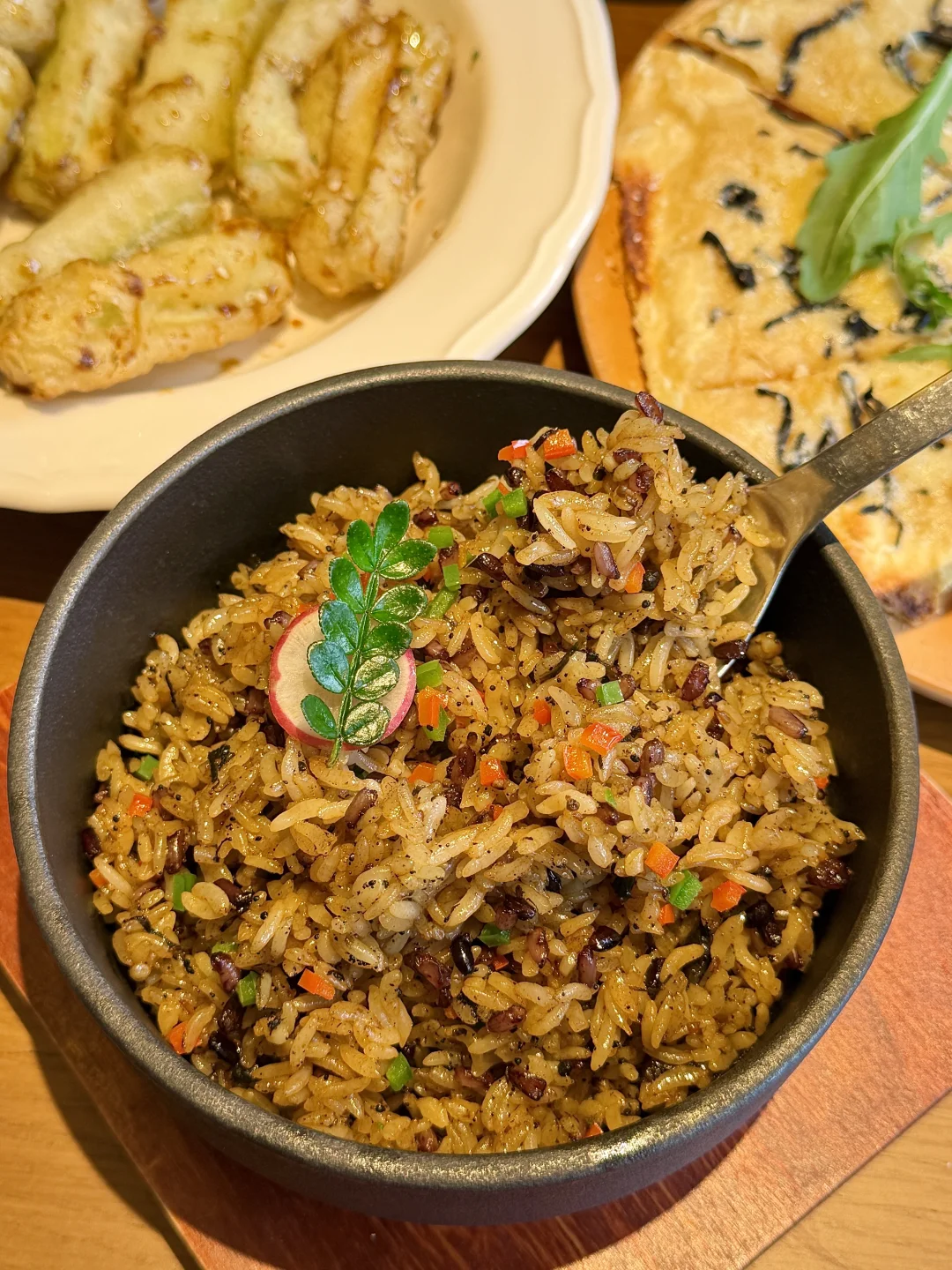 一点都不夸张!这家吃过之后被我和室友纳入年度清单了!叫:荼集素食。果然跟着本地的士师傅推荐吃没踩雷…真的有被惊艳到🥹 主打的素食文化,很有特色~不仅融合了川菜、湘菜、东南亚菜,还有甜品小吃都好好吃!真是拿捏我的胃了!黑松露炒饭一定要尝尝!还有川香麻辣锅和松茸药膳锅都好满意