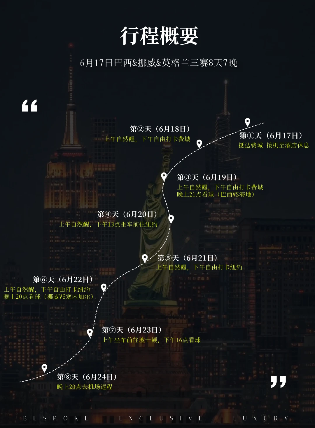 决赛高攀不起,还不能看小组赛了❓今天78就给大家做了一个8天7晚的世界杯定制行程👉可以同看到🇧🇷巴西队+🇳🇴挪威+🏴英格兰的3场小组赛⚽️比赛!性价比不是一般的抗打!人均4个W出头,妥妥值!!还带7晚酒店和接送机、比赛日接送、费城-纽约-波士顿包车,全程专车🚗独享拒绝拼车!