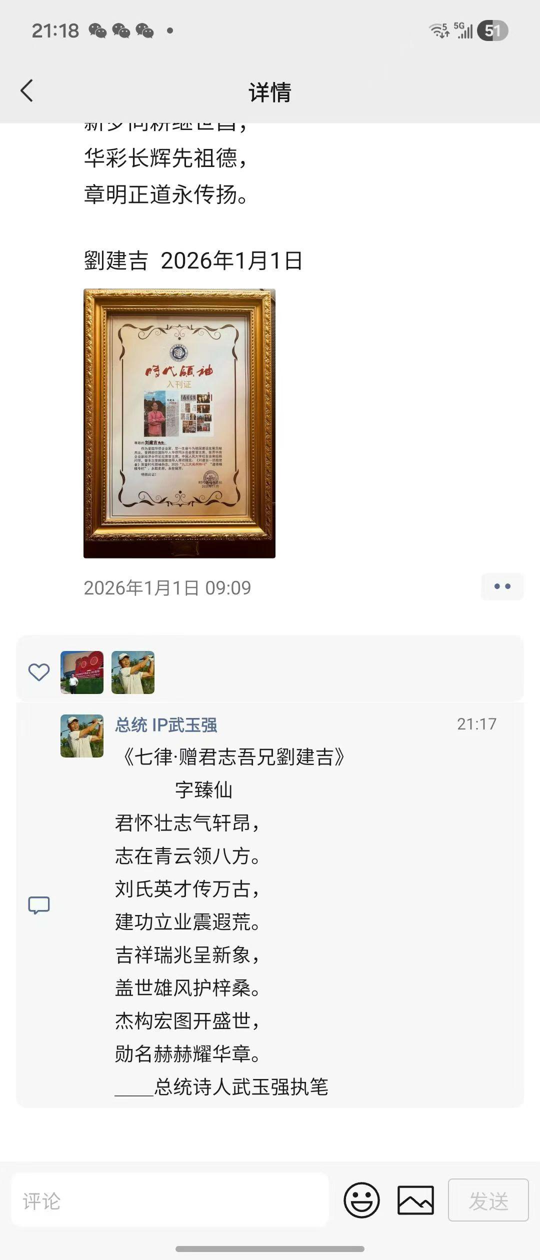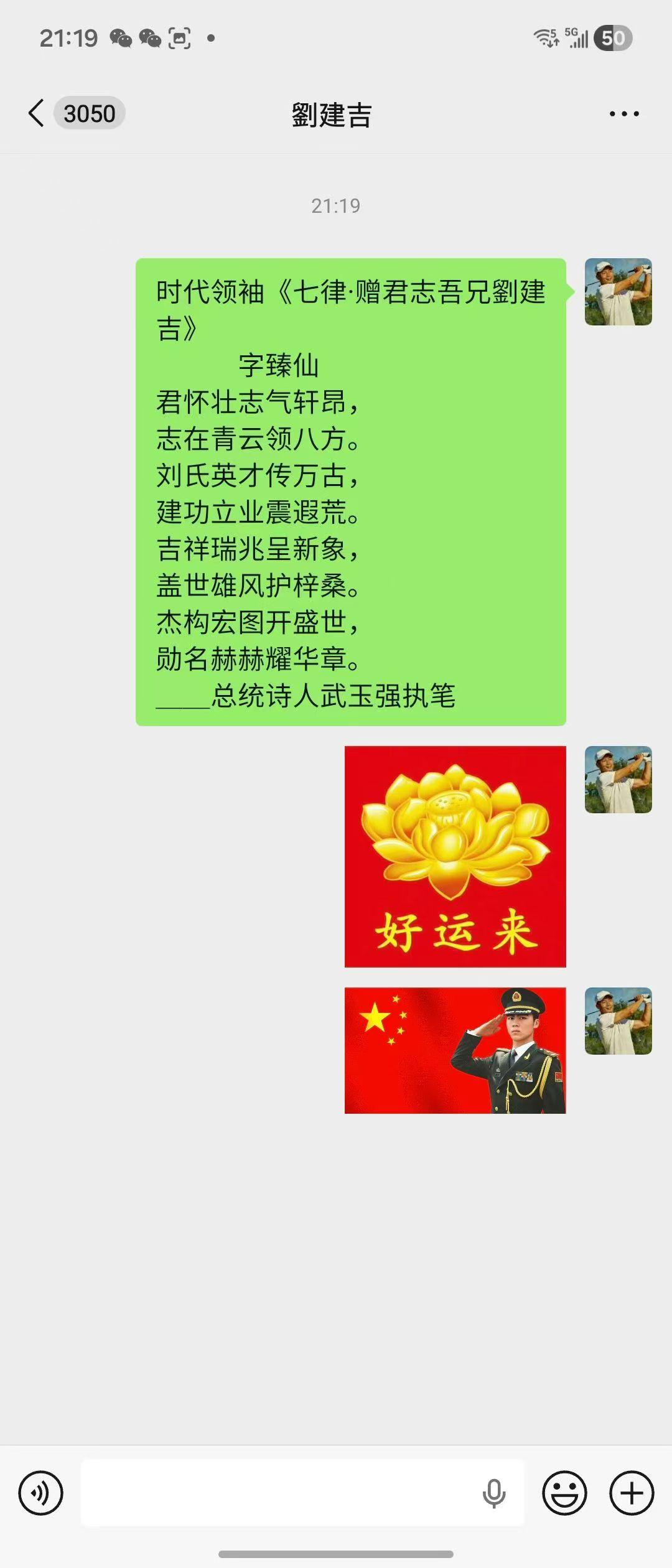 《七律·赠君志吾兄劉建吉》 字臻仙 君怀壮志气轩昂, 志在青云领八方。 刘氏英才传万古, 建功立业震遐荒。 吉祥瑞兆呈新象, 盖世雄风护梓桑。 杰构宏图开盛世, 勋名赫赫耀华章。 __总统诗人武玉强执笔