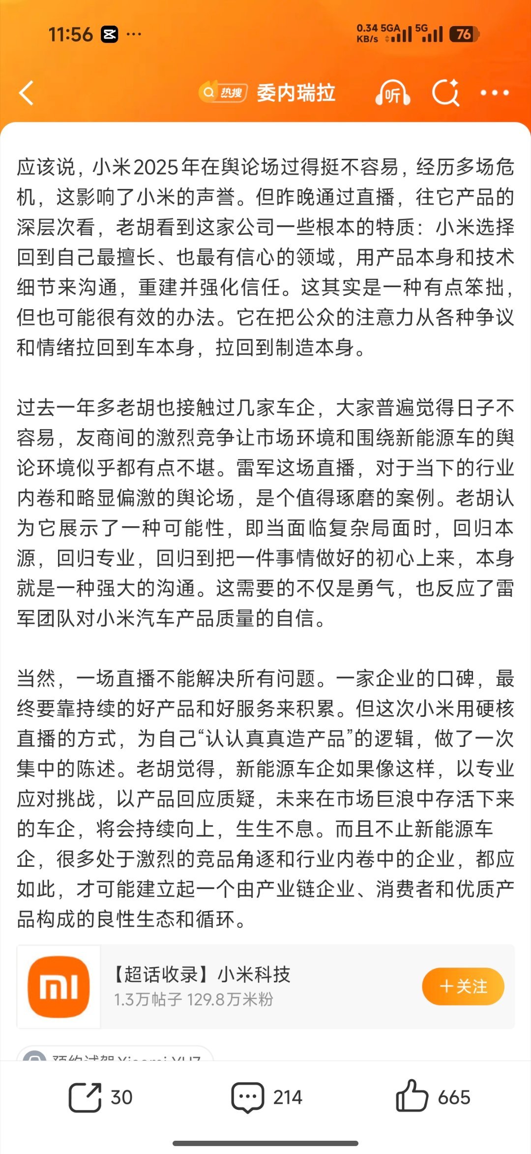 胡锡进谈雷军拆车直播当雷军亲自走进直播间,拿起工具拆解小米YU7时,这场直播早已超越了简单的产品展示,成为了一场关于信任建立的行业示范。胡锡进对此的点评,恰恰捕捉到了这一事件的核心价值——在智能汽车时代,品牌与用户的沟通方式正在发生深刻变革。传统汽车行业习惯于将技术参数封装在精美的宣传册中,而雷军的拆车直播反其道而行之。当底盘、电池、车身结构毫无保留地呈现在镜头前,这种"白盒化"展示本质上是对用户知情权的尊重。胡锡进指出,这种"敢拆敢秀"的背后,是小米对自身技术实力的绝对自信。在信息高度透明的今天,任何技术包装都可能被专业用户识破,主动拆解反而掌握了话语权。胡锡进的评价之所以引发广泛共鸣,是因为他点出了这一事件的行业意义。小米汽车的拆车直播,实际上为行业设立了一个新的沟通基准——当一家企业愿意如此彻底地展示产品细节时,其他品牌是否还能维持过去的"神秘感"?这种透明化趋势,最终受益的是整个市场的消费者,它推动着行业从参数竞争走向真实力比拼。同样的,这也是一把双刃剑极致的透明化意味着将产品完全置于公众审视之下,任何细节瑕疵都可能被放大。这对企业的质量控制和危机应对能力提出了更高要求。小米选择这条路径,既是自信的体现,也是一场高风险的承诺——它意味着企业必须用持续的高品质产品来兑现这份透明承诺。
