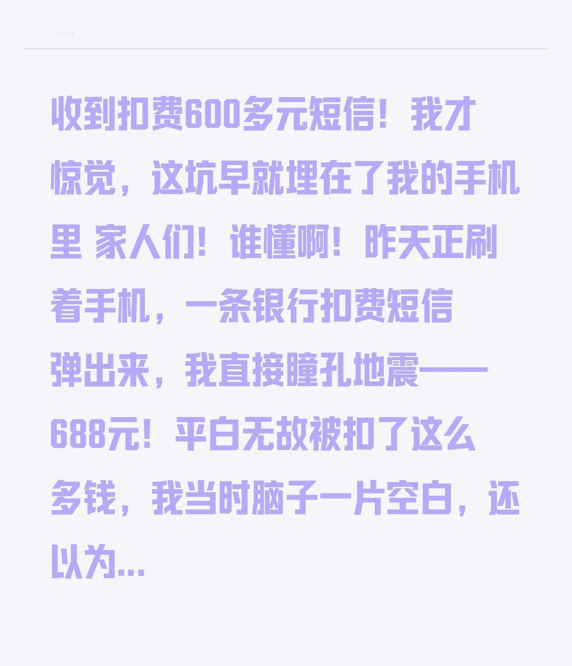 收到扣费600多元短信!我才惊觉,这坑早就埋在了我的手机里 家人们!谁懂啊!昨天正刷着手机,一条银行扣费短信弹出来,我直接瞳孔地震——688元!平白无故被扣了这么多钱,我当时脑子一片空白,还以为是银行卡被盗刷了! 赶紧翻账单明细,结果一看收款方,我瞬间懵了,居然是半年前随手点过的一个保险平台!这下我才想起来,当时刷短视频,弹出个“免费领百万医疗险”的广告,说是首月只要1元,抱着占便宜的心态,我就填了信息,扣了1块钱之后,我压根没当回事,早就把这事儿抛到九霄云外了。 我还傻乎乎地以为,不续费就自动停了,哪知道这就是个陷阱!客服说,当时勾选了“自动续费”,而且协议里写得明明白白,首月1元,次月起每个月扣688元!我赶紧去翻当时的记录,好家伙,那个“自动续费”的勾选框小得跟蚂蚁似的,藏在一堆小字里,不仔细看根本发现不了! 我立马打电话找客服要求退款,结果对方说,已经过了犹豫期,费用不能退,只能帮我取消后续续费。气得我血压飙升,这不是明摆着欺负人吗?688块钱,够我买好几斤排骨,够我充两个月的话费了,就这么打了水漂! 挂了电话我越想越后怕,赶紧去查了手机里所有的自动续费项目,不查不知道,一查吓一跳!还有视频会员、网盘会员、外卖红包,七七八八加起来,每个月居然要白白多花好几十! 家人们,你们是不是也跟我一样,随手点过“1元体验”“免费领取”的活动?是不是也从来没仔细看过那些密密麻麻的协议?现在想想,这些商家就是抓住了我们贪小便宜、嫌麻烦的心理,用极低的门槛让我们上钩,然后悄无声息地掏空我们的钱包! 这688块钱,就当是我交的智商税了。但我真心希望,刷到这条视频的朋友们,赶紧去检查一下自己的手机,把那些不需要的自动续费全都关掉!别让我们的血汗钱,白白喂了这些套路! 最后问大家一句,你们有没有遇到过类似的扣费坑?评论区里聊一聊,让更多人避坑!
