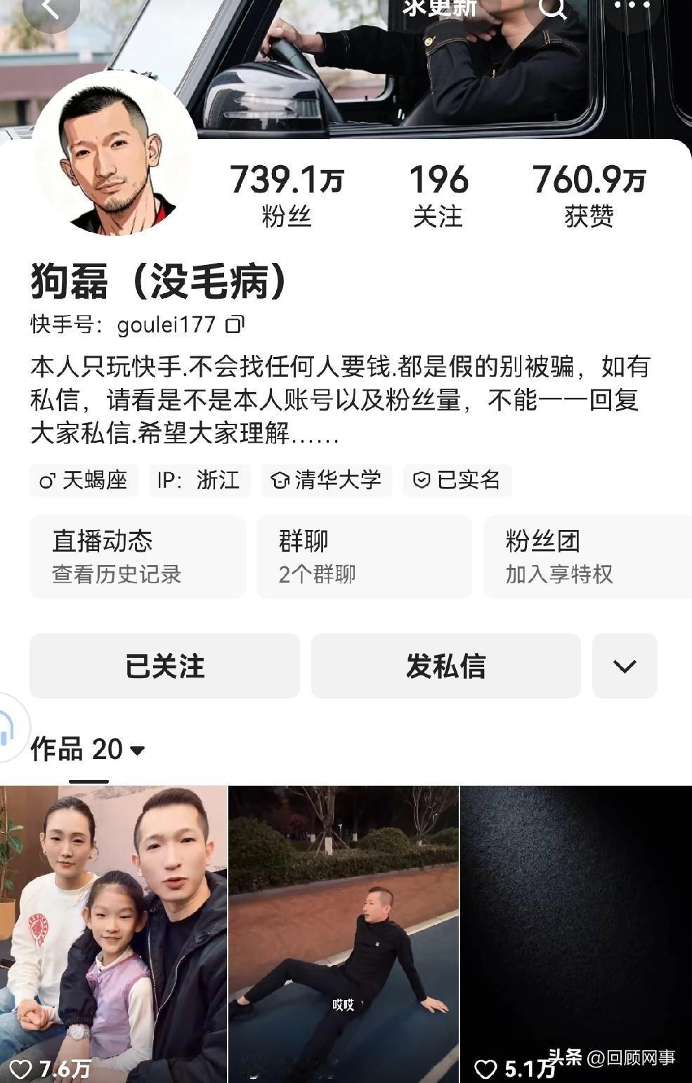 Gou磊粉丝疯涨200万,遭“仙家”高频率举报30余万次! Gou磊的账号在不到一周时间迅猛涨粉200万,一脸懵逼!连麦达摩吐槽说道:我还是养养(健康)积分吧,不然会被官方限流。我与“仙家”发生冲突接到30万条Ju报,从每场直播人气五六十万到现在二三十万,开播10分钟都上不去10W+。 官方明确告诉我“限流”!我都不知道涨来的是什么粉丝,看他们还都是小活人,不知道是不是假粉。达摩提醒:你已经超过500万粉丝属于头部网红,一言一行要注意!