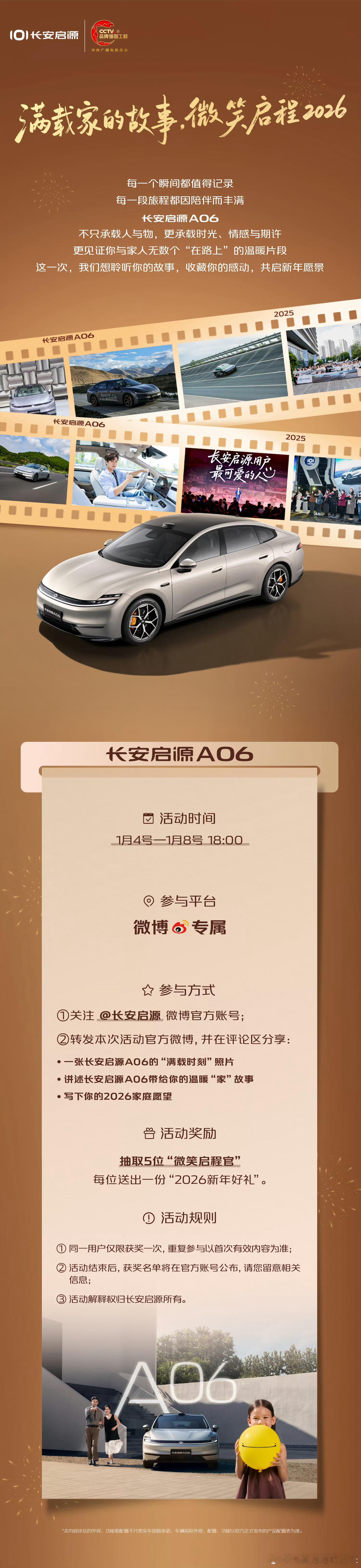 : 新年伊始,我们满怀期待,想听听您与 的故事。那些关于家、关于旅途、关于温暖的记忆,都值得被记录。诚邀您分享与长安启源A06相伴的温暖片段,无论是满载而归的喜悦,或是途中偶得的小确幸,都是我们共同走过的痕迹。1月8日18:00,我们将在评论区选取5位“微笑启程官”,送出一份“2026新年好礼”,让我们共同珍藏这些属于家的移动时光。