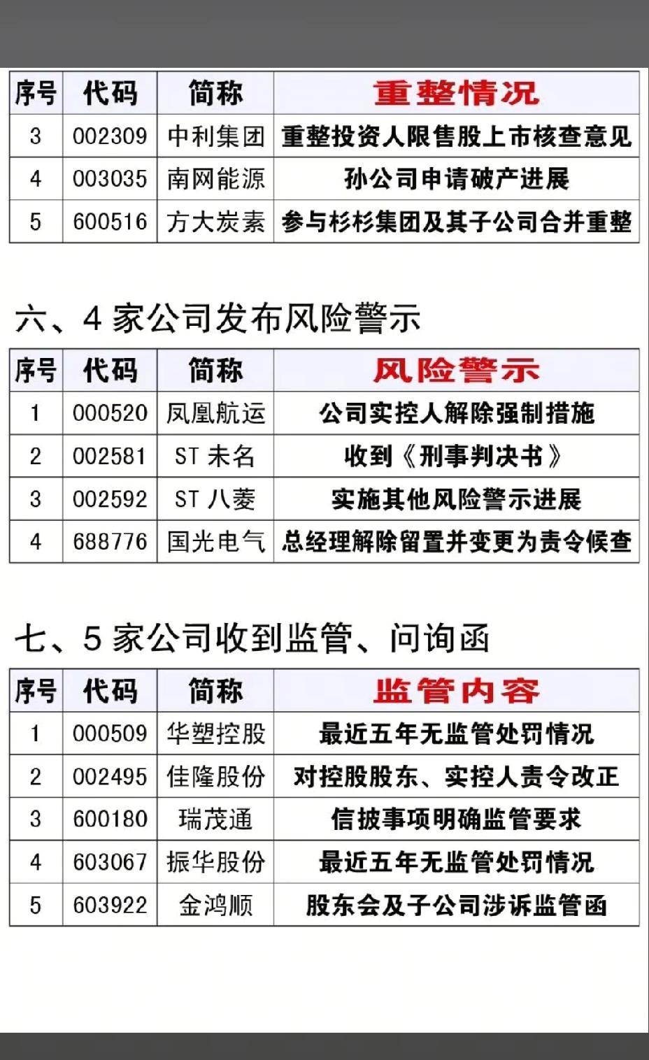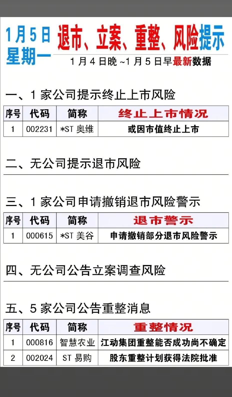 1月5日,周一A股这些股票要注意风险!!! 1家公司提示终止上市风险;1家公司申请撤销退市风险警示;5家公司公告重整消息;4家公司发布风险警示,重点关注:凤凰航运实控人解除强制措施,后市值得关注;5家公司发布收到监管、问询函!!!