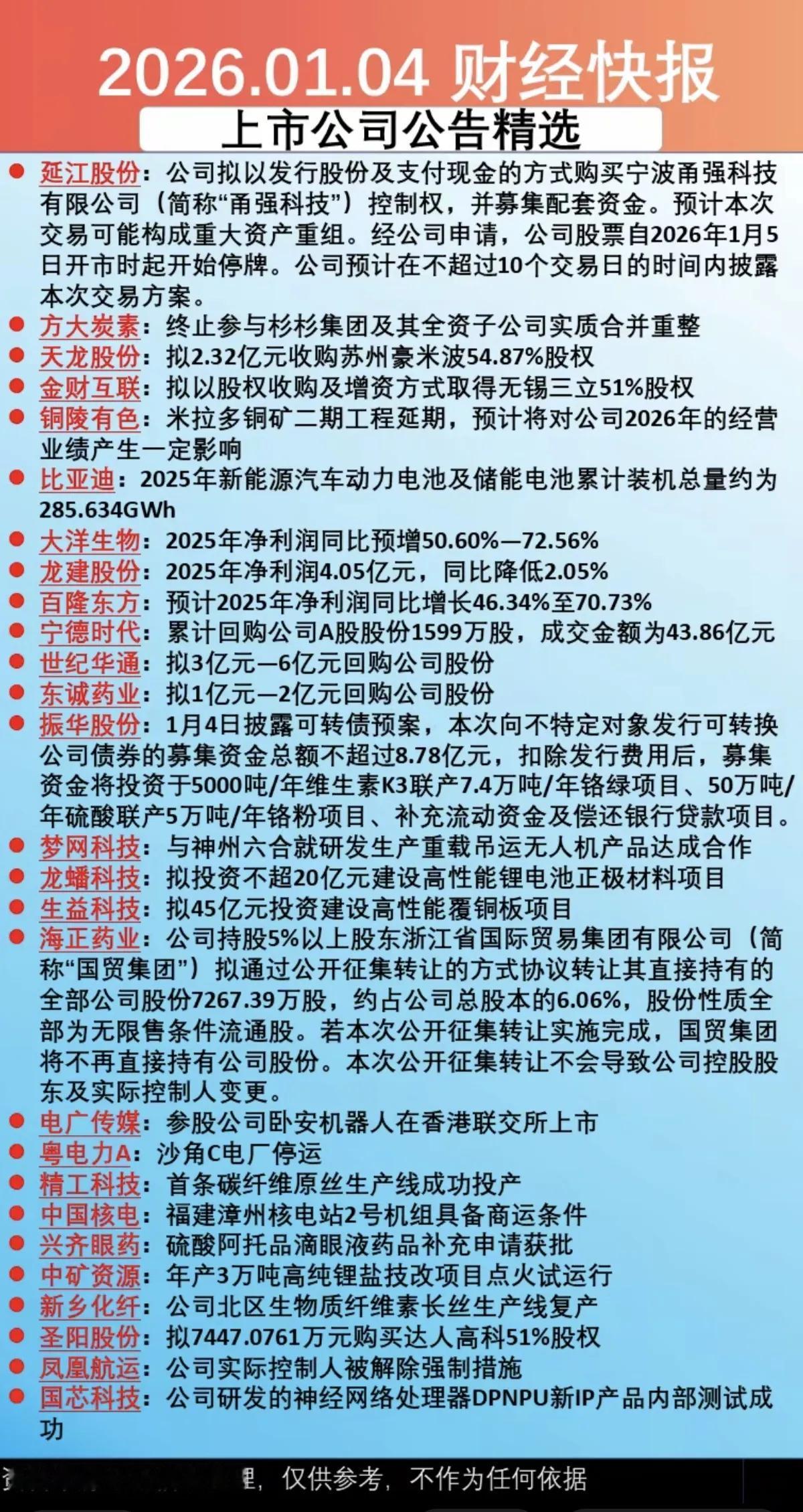 1月5日,周一A股盘前热点新闻汇总一览表!!! 方大炭素终止参加杉杉集团及其全资子公司实质合并重整,后市值得重点关注;龙建股份25年净利润4.05亿,后市值得期待;世纪华通拟以3亿-6亿回购公司股份,后市值得高看一眼!!!