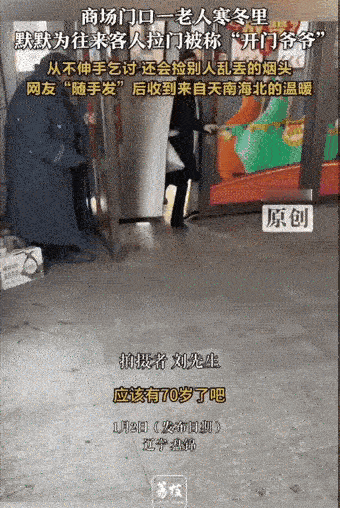 破防了!辽宁一网友无意间发现一位佝偻腰的大爷守在商场门口,看见有人走近就去拉开那扇又沉又冷的门,起初以为他是商场的保安,但是走近后发现大爷手中一直拿着一个不锈钢的小碗。 网友当时正裹紧羽绒服往商场里冲,冷不丁看见个佝偻的身影在门口晃悠。那天辽宁的气温低至-10℃,寒风卷着碎雪打在脸上,像小刀子刮一样。商场那扇自动感应门坏了半边,剩下的手动门又厚又沉,合着外头的冷气,拉一下得费不少劲。大爷就守在门旁,背弓得像张弯月,穿着件洗得发白的旧棉袄,袖口磨出了毛边。看见有人拎着东西过来,他就颤巍巍地挪过去,伸出干瘦的手,用尽全身力气把门拉开,还得用身子抵着,生怕风把门关回去。 网友原本以为大爷是商场雇来的临时保安,毕竟这扇门坏了快一周,之前每次来都得自己费劲拉。可这次走近了才发现,大爷的另一只手里,紧紧攥着一个掉了瓷的不锈钢小碗,碗沿磨得发亮,里面躺着几枚皱巴巴的一元纸币和几个硬币。网友心里咯噔一下,停下脚步,递过去一杯刚买的热豆浆。大爷愣了愣,接过豆浆时,手背上的青筋和冻疮看得一清二楚,他连声道谢,声音沙哑得像被砂纸磨过。 攀谈中网友才知道,大爷今年72岁,姓刘,家就住在附近的老小区。儿女都在外地打工,老伴前年走了,他自己因为年轻时干重活落下腰病,直不起身,也干不了重活。前几天出门买菜,看见商场门口的门坏了,好多人拉不动,还有小姑娘因为拉门把手里的东西撒了一地,急得直哭。他就天天揣着个小碗过来,帮人拉门。有人会随手给点零钱,有人会递瓶水,也有人连声谢谢都不说就径直进去,他都不在意,依旧守在门口,看见人来就伸手拉门。 “门沉,年轻人拎着东西不好开,我帮衬一把,他们愿意给点就给点,不给也没事。”刘大爷喝了口热豆浆,冻得发紫的脸上慢慢有了血色。他说自己每个月有几百块的养老金,够吃饭,出来拉门不是为了赚多少钱,就是觉得自己还能帮上点忙,不至于在家待着没用。网友看着大爷佝偻的背影,又看了看那扇被他拉了无数次的门,鼻子突然一酸,掏出兜里的零钱放进大爷的小碗里。 这一幕被网友拍下来发到网上,很快就火了。视频里,大爷费力地拉开门,笑着给人让路,阳光打在他花白的头发上,明明是凛冽的寒冬,却让人觉得格外温暖。有附近的市民看到视频后,专门绕到商场门口,就为了给大爷送点热乎的包子,还有人给大爷送了件新棉袄。商场的工作人员也看到了视频,第二天就派人修好了那扇坏了的门,还专门找到刘大爷,邀请他去商场的保安室里歇着,说以后要是想帮忙,可以在门口引导一下顾客,商场愿意给他发点补贴。 刘大爷却摇了摇头,还是每天准时出现在商场门口。只不过现在门修好了,他不用再费力拉门,就改成了帮人提东西、指引方向。有人问他为什么不去保安室歇着,他说在门口待着习惯了,看着来来往往的人,听着他们说谢谢,心里就踏实。商场的工作人员拗不过他,就在门口放了一张小板凳,还每天给他送一杯热水。 网友的评论区里,大家都在说被刘大爷暖到了。有人说:“大爷不是在乞讨,是在靠自己的力气帮人,这才是最可贵的。”还有人说:“我们总说要帮助老人,可这位老人却在默默帮助我们。”甚至有外地的网友专门留言,说要来辽宁看看这位可爱的大爷。 其实在辽宁,像刘大爷这样的人还有很多。大连的一位老人每天在公交站帮人指路,一干就是十年;沈阳的一位退休工人,每天义务在小区里打扫卫生,从不求回报。他们都在用自己的方式,为这个社会贡献着力量,哪怕力量很微小,也能在寒冬里给人带来温暖。 善意从来都是相互的,刘大爷用自己的行动帮助了别人,也收获了别人的尊重和关爱。他让我们明白,帮助别人不一定需要多么大的能力,哪怕只是在别人需要的时候,拉一下门,指一下路,都能成为照亮别人的光。 各位读者你们怎么看?欢迎在评论区讨论。