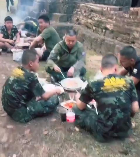 泰国军队吃火锅全部用筷子! 以前总以为泰国人不会用筷子,喜欢用手抓饭吃,没想到吃火锅的时候,各个士兵的筷子,用的飞起呀!泰国军队在一座古庙前,休整放松,享用烧烤和火锅。不知道这些士兵,会不会等肉真的烤熟了再吃?唯一的不足之处,就是打边炉用木头烧火锅,火锅和肉是一时熟不了。 当然了泰国军队可能不叫火锅,也可能不叫打边炉,可能就是简单的水煮菜。不过从现场来看,泰国官兵用一个炉子,然后上面放一个菜盆,一起煮肉和蔬菜,和我们的火锅,基本上完全一致。 泰国军队在边境冲突中,打得很出色,所以这些官兵,也是非常轻松。泰国军队所处的地带,位于哪里,博主就不说了吧,大家也都明白。看到泰国军队吃得这么丰盛,觉得还是泰国经济发展的比较好,至少在前线不是吃单纯的大米白饭配咸菜。 至少是有可乐、有饮料、有火锅、有肉、还有菜,相当不错。最重要的是,以前看泰国军队吃饭的时候,总是喜欢用手抓饭吃,以为这些军队人员也不会用筷子,没想到一到吃火锅的时候,各个都是用筷子的高手。 可能就是纯习惯问题,不吃火锅的时候用手抓,吃火锅的时候用筷子,应该是这样的。