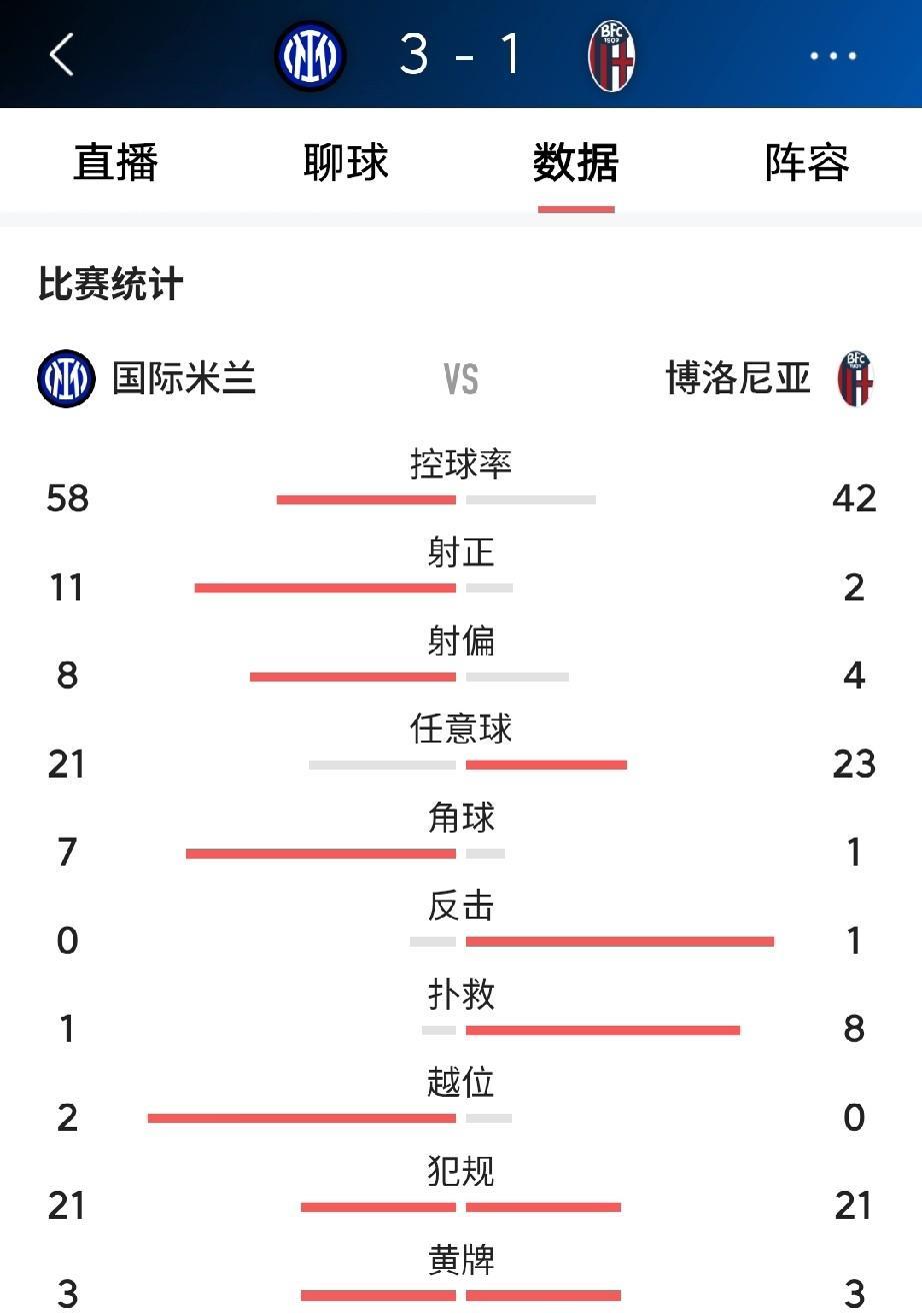 3-1主场大胜苦主博洛尼亚,国米可算打出一场有统治力的比赛。 实际上3-1的比分并不能反映本场国米的场面优势,这场比赛国米19次射门11次射正,博洛尼亚得益于门将拉瓦利亚的出色发挥,完成8次扑救,才避免一场惨败。