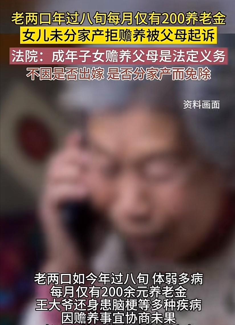 江苏镇江,老夫妻将家中的财产几乎全部给了二女儿和上门女婿,平时还帮忙照顾二女儿的孩子们,事后,二女儿却拒绝独自给自己养老。原因是,二女儿认为2个外嫁的姐妹也是老人的孩子,也应承担赡养责任。2个外嫁的女儿自然不同意,老人就赡养问题多次与3个女儿协商未果,无奈将3个女儿告上法庭,法院这样判! 江苏镇江一对老夫妻一辈子省吃俭用,把家底全贴给了招上门女婿的二女儿,十几年如一日帮着带娃做家务,可等自己病倒需要人照顾时,三个女儿却互相踢皮球。这场闹上法庭的家庭矛盾,戳中了太多人对亲情与利益的感慨。 家住镇江的王大爷和张大妈,一辈子没什么大本事,就靠着做点小生意和种地攒下了些家当。老两口有三个女儿,大女儿和三女儿早早外嫁他乡, 只有二女儿留在身边,还招了上门女婿,按当地习俗,这就是要给老两口养老送终的。老两口也打心底里把二女儿一家当成了晚年依靠,打从二女儿结婚起,就开始毫无保留地付出。 先是把自己经营了十几年的小杂货铺直接交给了二女儿和女婿打理,这可是老两口大半辈子的心血,不仅能稳定盈利,还占着不错的地段。 紧接着,又把家里的两套老房子过户到了二女儿名下,自己则搬到小房子里住,就连多年攒下的十几万存款,也全拿出来帮二女儿女婿扩大生意规模。 除了出钱,老两口的精力也全扑在了二女儿家的琐事上。二女儿先后生了两个孩子,从坐月子到孩子上中学,老两口几乎包揽了所有带娃任务。 每天天不亮就起床做早饭,送孩子上学,下午准时在校门口等候,回家还要洗衣做饭、打扫卫生,让二女儿和女婿能安心忙生意。 尤其是王大爷,年轻时落下的腰伤,因为长期抱孩子、干重活,疼得越来越厉害,可他从没跟二女儿抱怨过一句,就想着多帮衬点,让孩子们日子好过些。 就这么辛苦操劳了十几年,孙辈们顺利长大,老两口也熬到了八十岁高龄。常年的劳累让两人身体彻底垮了,张大妈患上了严重的关节炎,走路都需要人搀扶, 王大爷更是雪上加霜,突发脑梗后留下了后遗症,说话含糊不清,半身不遂,每天都需要人贴身照顾,吃药、康复治疗的费用更是一笔不小的开支。 老两口每月加起来只有两百多块的养老金,根本不够支撑日常开销和医疗费用,只能指望二女儿能承担起养老责任。 可当老两口跟二女儿说出自己的难处后,得到的回应却让他们心凉了半截。二女儿起初还会偶尔送点钱和吃的来,可没过多久就开始推脱,说自己生意不好做,家里开销也大,单独承担父母的养老费用压力太大。 她明确表示,大姐姐和三妹妹虽然外嫁了,但也是父母的女儿,赡养老人是三个姐妹的共同责任,不能只让自己一个人扛,必须三个人平摊费用、轮流照顾。 走投无路的老两口只能托人联系上了两个外嫁的女儿,希望能坐下来好好商量养老的事。可两个女儿一听到要分担赡养责任,当场就懵了,随后满是委屈地拒绝了。 大女儿红着眼眶说,从小到大,父母的心思就从没在自己身上用过,小时候穿的是二妹妹剩下的衣服,上学时父母也很少关心自己的成绩,结婚时父母就给了一点微薄的嫁妆,而二妹妹结婚时,父母又是给房又是给钱。 这么多年来,父母把所有的财产和精力都给了二妹妹,自己和三妹妹没沾到一点好处,现在老了需要人照顾了,却想起她们来了,这实在让人无法接受。 三女儿也跟着附和,说自己嫁得远,平时很少回娘家,父母有事从来都是找二妹妹,现在养老却要平摊责任,这太不公平了,她坚决不会承担。 看着自己辛苦养大的三个女儿在养老问题上互相推诿,王大爷和张大妈彻底寒了心,夜里常常偷偷抹眼泪。 走投无路之下,老两口只能在亲戚的帮助下,将三个女儿一同告上了镇江市当地法院,希望通过法律途径为自己的晚年寻一个保障。 最终判决结果为:二女儿每月向王大爷和张大妈支付赡养费500元,大女儿和三女儿每月各支付150元;后续老两口产生的医疗费用,扣除医保报销部分后,由二女儿承担50%,大女儿和三女儿各承担25%。 对此,你们有什么看法,欢迎评论留言~