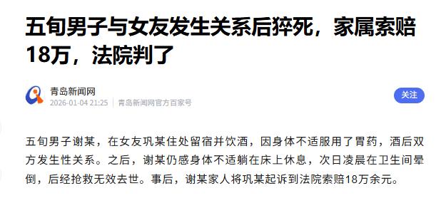 甘肃天水,55岁男子在女友家中喝完酒后,感到身体不舒服,吃了胃药,在身体仍不舒服的情况下,仍与女友发生关系,结果,随后晕倒猝死。事后,男子家属难以释怀要求男子女友承担20%的责任,赔偿18万余元损失。法院这样判! 甘肃天水的55岁的老陈(化名)和女友小刘(化名)已经相处了一段时间,感情稳定,两人时常会互相探望小聚。 事发当天,老陈像往常一样来到小刘家中,两人边聊天边小酌,气氛十分融洽。可酒过三巡,老陈突然觉得胃部不适,脸色也变得有些难看。小刘见状,赶紧拿出家里备用的胃药给老陈服用,老陈吃下药后,不适感稍有缓解。 尽管身体还没完全舒服,老陈仍与小刘发生了亲密关系。可就在事后没多久,老陈的不适感再次袭来,而且比之前更加严重,他只能躺在床上休息。 小刘以为老陈只是酒精上头加上药物反应,没太在意,只是时不时过去查看一下,见老陈只是昏睡,便没做进一步处理。 直到凌晨时分,小刘发现老陈起床去卫生间后许久没有出来,心里顿时咯噔一下,赶紧过去查看。推开门就看到老陈已经晕倒在卫生间的地上,脸色苍白,毫无反应。 小刘瞬间慌了神,急忙喊来邻居帮忙,一起把老陈抬到卧室的床上慌乱中,小刘没有第一时间拨打急救电话,而是决定先去寻找老陈的同事帮忙,希望能有人一起拿主意。 小刘匆匆出门打车赶往老陈的工作地点,途中才想起拨打急救电话。等医护人员赶到小刘家中时,距离老陈晕倒已经过去了不短的时间。 医护人员立即对老陈展开抢救,随后将他送往医院继续救治,但遗憾的是,经过全力抢救,老陈还是没能醒过来,最终被确诊为猝死。 突如其来的噩耗让老陈的家属悲痛万分,难以释怀。在梳理事情经过后,家属认为小刘对老陈的死亡存在过错,理应承担相应的责任。 他们了解到,老陈此前曾因缺血性脑血管病、高血压等问题住院治疗,身体本就不算硬朗,而小刘作为相处已久的女友,对老陈的身体状况应该有所了解。 家属提出,老陈在饮酒后身体不适,小刘既没有及时劝阻两人发生亲密关系,在老陈晕倒后又没有第一时间采取有效的急救措施,延误了最佳抢救时机。 基于这些情况,家属将小刘起诉至法院,要求她承担20%的赔偿责任,支付医疗费、死亡赔偿金等各项损失共计18万余元。 法院受理案件后,对事件的全过程进行了详细调查核实,调取了相关的医疗记录、通话记录等证据,还向双方当事人及知情邻居了解了情况。 法院审理后认为,老陈作为完全民事行为能力人,对自己的身体状况最为清楚,却在明知自身有基础疾病的情况下饮酒,后续又在身体不适的状态下与小刘发生亲密关系,这些行为是导致其猝死的主要原因,因此老陈应当自行承担主要责任。 同时,法院也指出,小刘作为老陈的女友,两人相处时间较长,对老陈的身体状况有一定了解。事发时两人处于私密空间,没有第三人在场,当一方发生危险时,另一方负有合理的救助义务。 而小刘在发现老陈晕倒后,没有第一时间拨打急救电话,而是选择先外出寻找老陈的同事,导致抢救时机被延误,其救助措施存在明显不当,对老陈的死亡后果存在一定过失,应当承担相应的次要责任。 综合考虑事件的起因、双方的过错程度以及实际情况,法院最终酌情判定小刘承担10%的赔偿责任,赔偿老陈家属各项损失共计9.3万余元。一审判决后,小刘不服提起上诉,天水市中级人民法院经过审理,最终驳回了上诉,维持原判。 这起案件的判决,明确了亲密关系中救助义务的边界,也让不少人意识到,饮酒后服药可能带来的健康风险。 生活中,酒与药同服引发的危险屡见不鲜,一些药物与酒精反应可能导致头晕、恶心,严重时甚至会引发休克、死亡,这是每个人都需要警惕的安全红线。 一场意外猝死,让两个家庭都陷入了痛苦之中,原本的亲密关系也以这样尴尬的方式落幕。对此,你们有什么看法,欢迎评论留言~