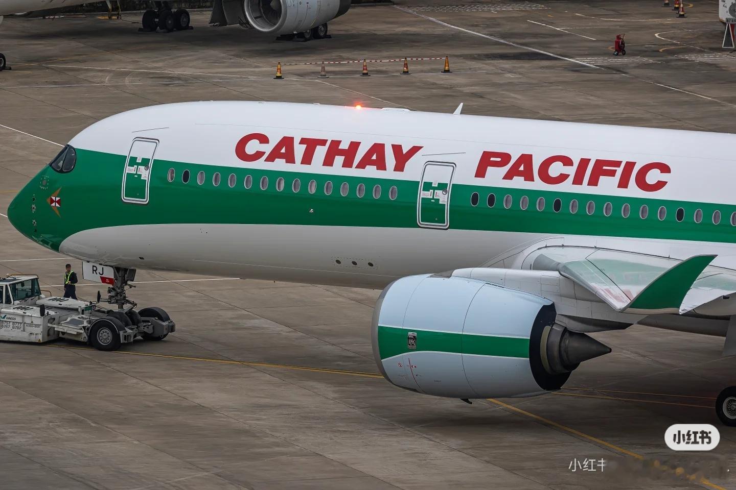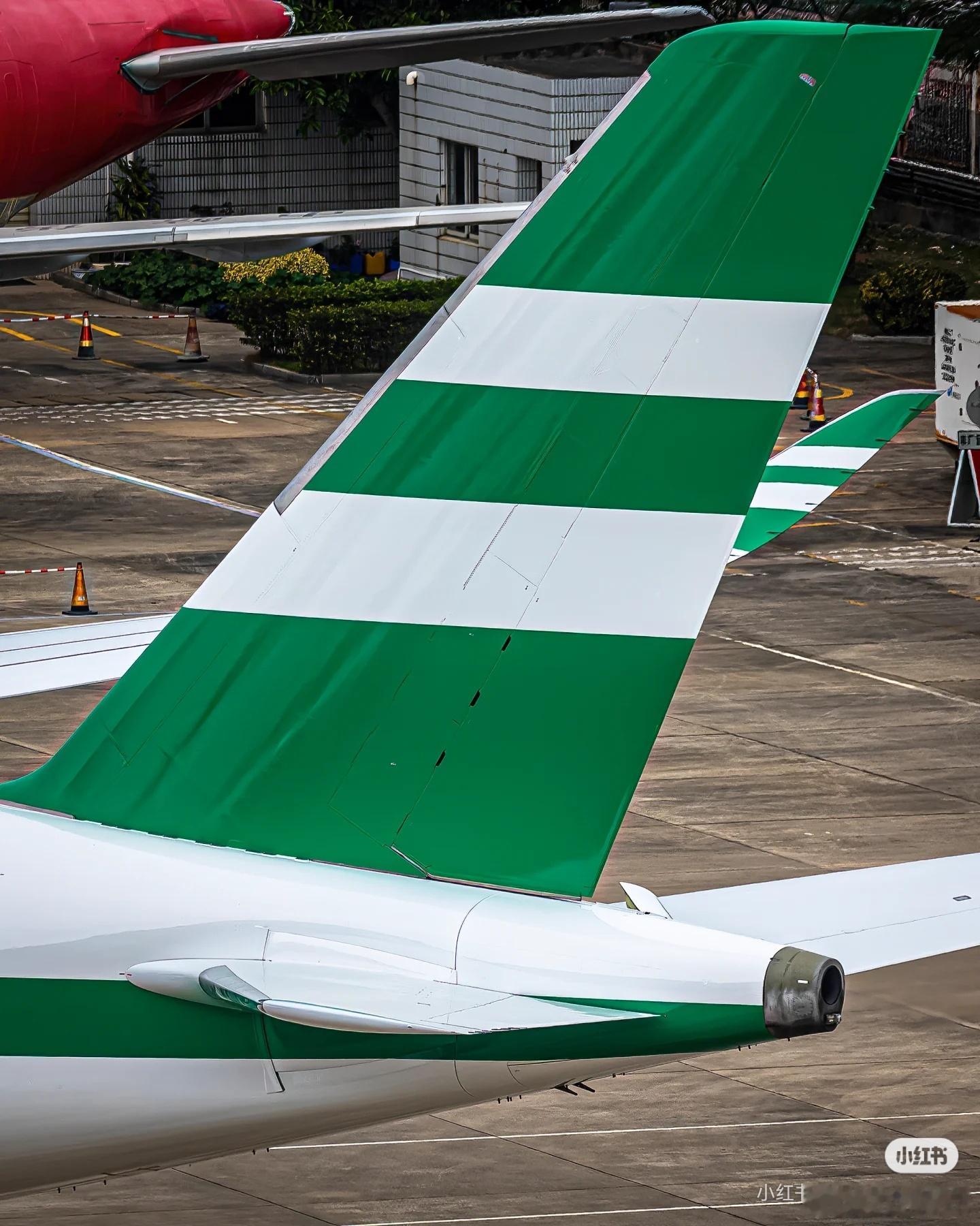 红书网友XMN-5038拍摄的国泰复古涂装,新一代客机极致流畅的线条与传统涂装碰撞,确实别有一番风味。欺诈线的流行是为了掩盖当时飞机工艺的粗糙,增强飞机的修长感,不过随着制造工艺越来越精湛,平滑的气动外形也就不再需要修饰,当然,机身也是越来越长了。最有意思的是第四张图,一个是装复古,一个是真复古。