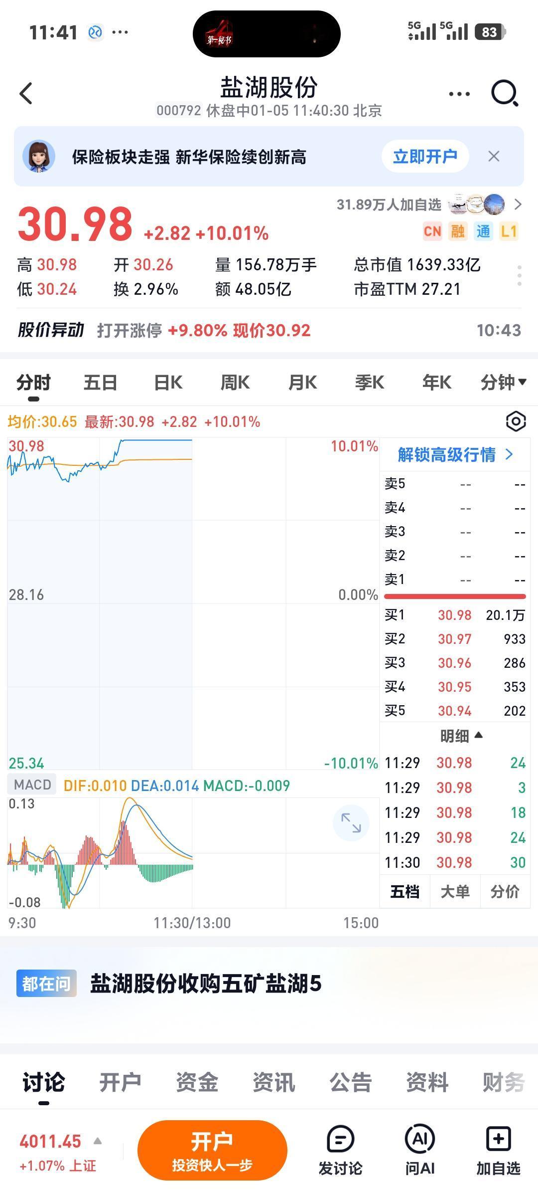 沪指开门红 上午收盘4011点,大涨42.61点,锂电,芯片,航天,保险纷纷大涨,银行深调,上了4000点是否要跑路,因为又上了一个新里程?下午再看吧!