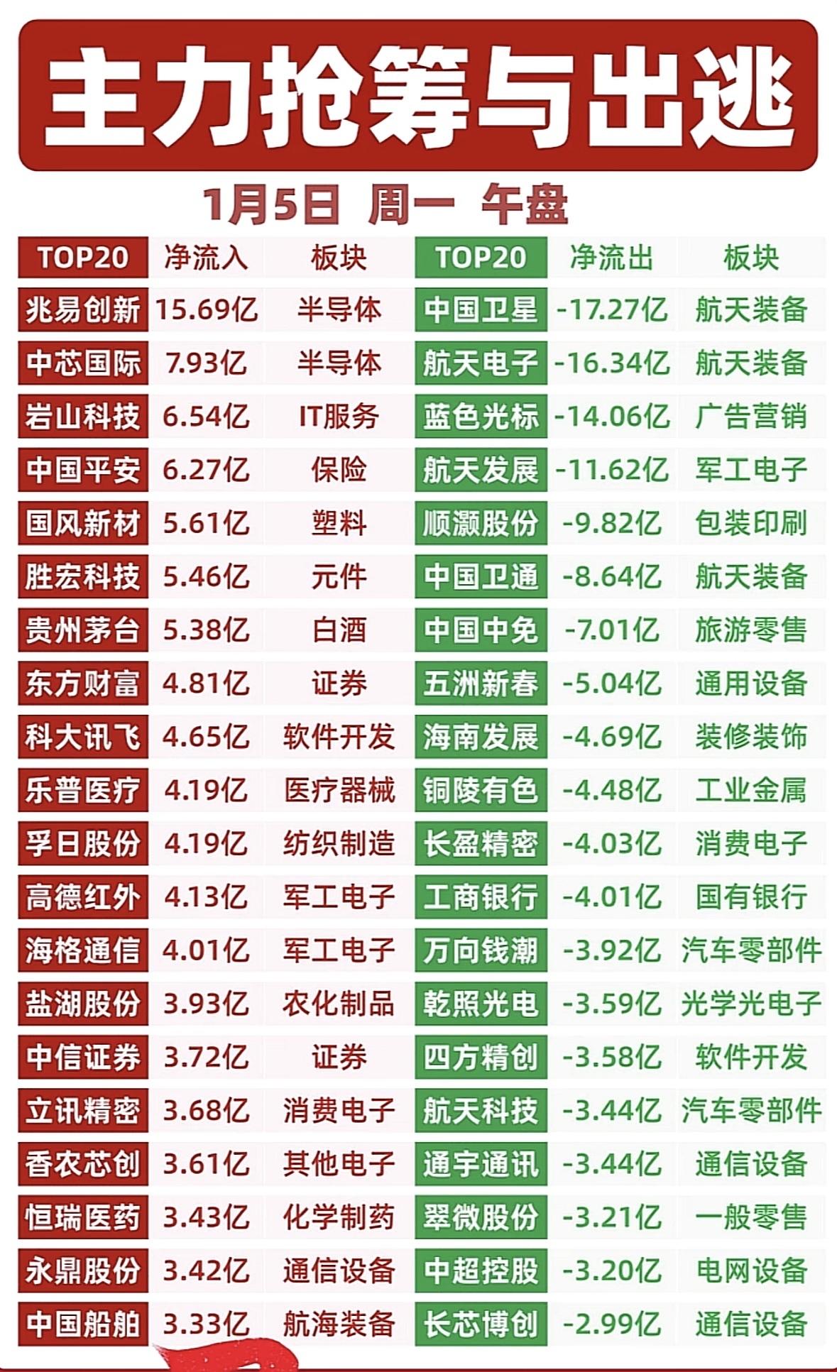 主力抢筹与出逃,1月5日午盘TOP20分析 半导体吸金航天承压 白酒证券获青睐 资金分化显板块轮动