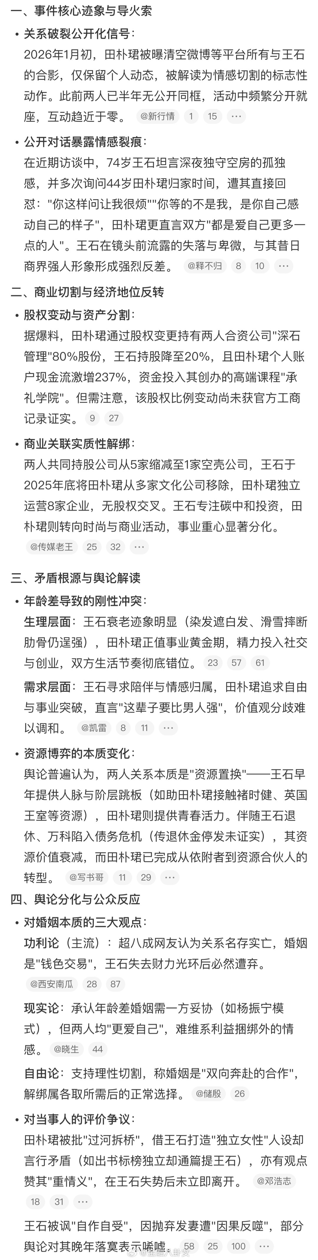 田朴珺 王石看了下AI,简单来说,就是这对“老少配”夫妻,无论是感情还是商业上,似乎都走到了“曲终人散”的边缘