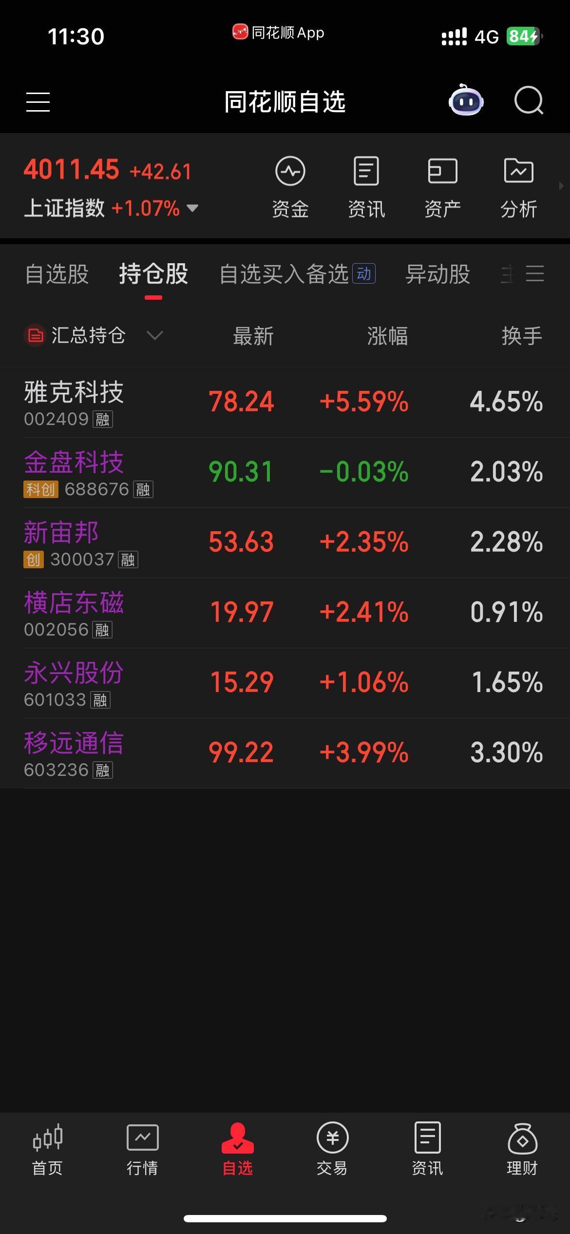 今天迎来了开门红,大盘略为高开后一路上扬。成交量放大明显。个股精彩纷呈。我的股票也大部分上涨,不过涨得不多。金盘今天跟随海南概率洗盘。早盘在新开户的长江证券账户买入雅克。上午浮盈2千多点。