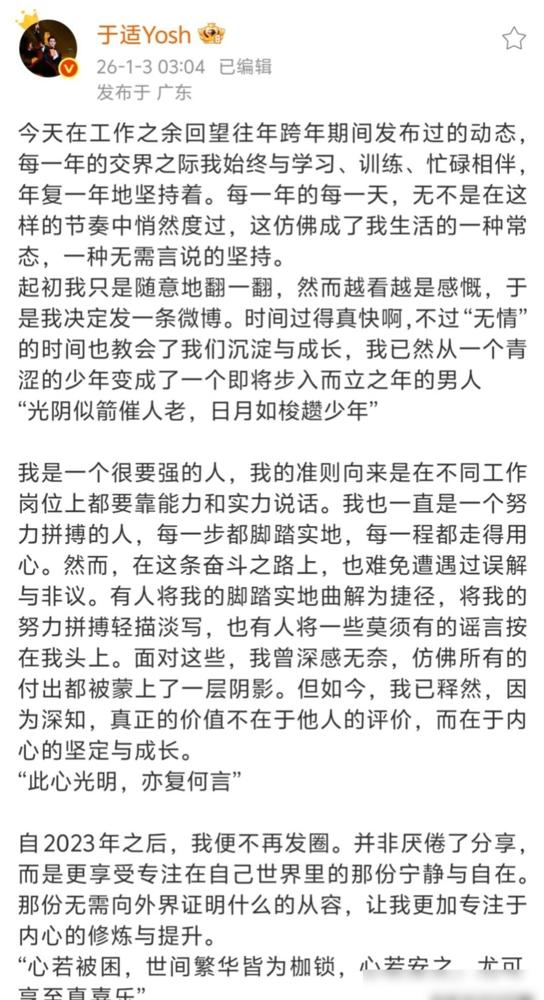去年被全网嘲“靠脸上位”的小生,刚刚用最狠的方式打了所有人的脸。凌晨三点,于适突然撕开那道旧伤口。 他在深夜突然发了组动态,晒出去年三月后就没更新过的朋友圈截图,还有杀青时满脸泥土的剧照。这种直接甩出“时间戳”的回应方式,确实比任何公关文案都要硬气。 最戳我的是那个细节:他朋友圈最后一条动态竟然停留在接到“姬发”角色那天。这意味着在全网都在质疑他、甚至骂他的时候,他愣是把自己按下了“静音键”,一个字都没解释。 说实话,我觉得这种定力挺可怕的。他在这一年里没有急着直播哭诉,也没到处发律师函,而是跑去剧组把自己练出了一身伤,这种“把自己藏起来”的打法,反而是对流言最好的回击。 尤其是听说他在片场收工后,笔记记得比场记都满,这大概就是所谓的“笨功夫”吧。在大家都想走捷径、立人设的圈子里,他可能觉得只有手里的作品才是不缩水的本钱。 我也在想,他晒那张海浪冲刷礁石的照片到底想说什么。大概是想表达,与其去跟那些泡沫撞个头破血流,不如让自己变成一块搬不动的石头,等潮水退了,谁还在岸上站着一目了然。 这种回应挺有高级感的。他没想过要说服谁,他只是在用一年的沉默告诉大家:你们吵你们的,我只负责把路走扎实。 说白了,流量能让人一夜之间看到你,但只有像这种近乎偏执的职业素养,才能让人打心底里服气。 这种“狠劲”真的久违了。不需要口舌之争,时间最后总会把最真实的答案刻在作品里,送给那些真正看戏的人看。