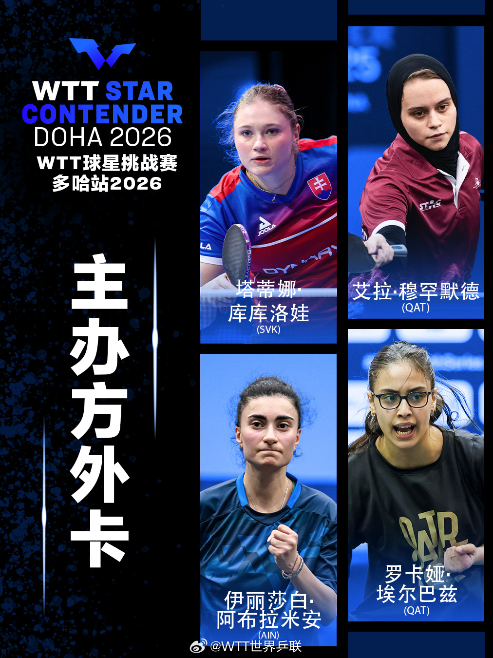 #温瑞博获多哈挑战赛外卡# WTT球星挑战赛多哈站2026将于1月13日至18日在卢赛尔体育馆举行,世界乒乓球顶级球星将继续在卡塔尔争夺桂冠WTT提名名单:林德、迪亚兹、西蒙·高茨、穆克吉WTT青少年提名:温瑞博、刘叡潾主办方外卡(男单):雨果、杜达、阿卜杜勒瓦哈卜、库瓦里主办方外卡(女单):库库洛娃、穆罕默德、阿布拉米安、埃尔巴兹#WTT球星挑战赛多哈站2026##看WTT上咪咕#