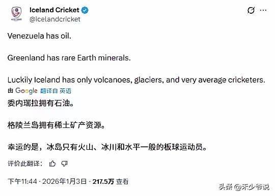 人人自危,连冰岛都害怕美国“惦记”自己这一亩三分地,冰岛板球协会“冰岛只有火山和水平一般的板球运动员” 昨天冰岛板球协会在社交平台上发文称“委内瑞拉有石油,格陵兰岛有矿产和稀土,而幸运的是冰岛只有火山和水平一般的板球运动员” 不得不说美国强掳马杜罗之后除了五常之外其他国家基本都人人自危,就怕自己国家有什么资源被美国给“惦记”上,就连冰岛这样资源相对匮乏的国家都怕美国“惦记”上自己的几个水平一般的板球运动员。