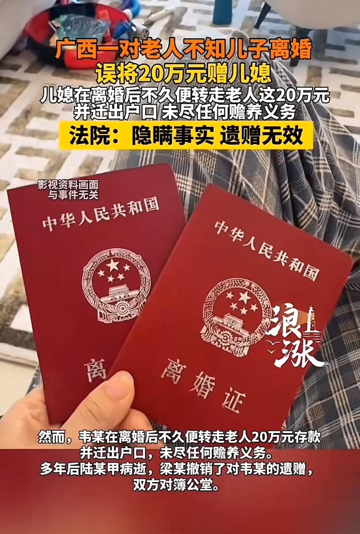 广西这对老夫妇的遭遇太让人心疼了。2015年,儿子陆某和儿媳韦某闹离婚,法院8月就判决准予离婚,可韦某没把这事儿告诉老人。老人一心盼着儿媳留下,还能给自己养老,8月19日就立下《遗赠》,把房产和20万存款都给了她。 结果呢,韦某签完协议没几天,就转走20万,之后还改嫁,对老人不管不顾。多年后陆大爷病逝,梁大妈撤销遗赠,双方闹上法庭。好在法院判了遗赠无效,驳回韦某上诉。这也提醒大家,立遗嘱得保证是真实意愿,靠隐瞒欺骗影响意愿,遗嘱可就有瑕疵啦。