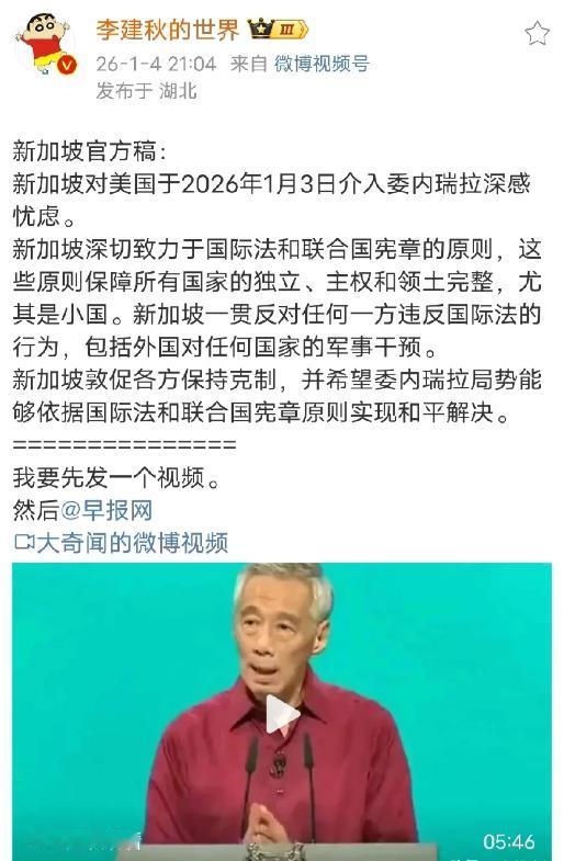 新加坡的小国论被自己打脸了,我记得俄乌冲突的,李显龙阐述了为什么要反对俄罗斯,支持乌克兰的原因,现在视频都还在,所以新加坡是支持制裁俄罗斯的,现在川普对委内瑞拉的行动,新加坡就发这几句冠冕堂皇的话,当初支持乌克兰的那些道理和行动呢?所以像新加坡这种站队西方的小国,就不要把自己的双标说得多么高大上了,虚伪就是虚伪,双标就是双标,还扯什么正义和公正! 这句话放在新加坡身上,简直再贴切不过。很多人都记得,俄乌冲突爆发后,这个一直标榜“中立”的小国,态度反常地站到了台前,用一套看似站得住脚的“国际法逻辑”,把反对俄罗斯、支持乌克兰的调子唱得很高。 李显龙当时多次公开阐述立场,这些视频至今还能在网络上找到。他反复强调,新加坡的立场无关选边站,核心是捍卫《联合国宪章》载明的“不侵犯他国领土完整和主权”这一基本国际原则,称这一原则是新加坡作为小国生存的根本。 为了践行这套“原则”,新加坡做出了东南亚国家中最为强硬的举动,不仅公开谴责俄罗斯的行动,还在2022年3月宣布对俄罗斯实施金融制裁,将俄罗斯中央银行、VTB等多家俄银行纳入制裁名单,限制相关加密货币交易,同时禁止向俄罗斯出口军事物资、电子产品等可用于冲突的物品。 新加坡外交部当时的声明写得明明白白,称新加坡是国际法的一贯坚定支持者,会严肃对待任何违反核心原则的行为。那会儿的新加坡,摆出的是一副“正义卫士”的姿态,仿佛自己就是国际规则的终极守护者。 可风水轮流转,当时间来到2026年1月,特朗普政府对委内瑞拉采取军事突袭行动,直接抓捕委内瑞拉总统马杜罗及其夫人,并宣称要“管理”委内瑞拉直至所谓“安全过渡”时,新加坡的“原则”突然就不见了踪影。 面对这场明显违反国际法、侵犯他国主权和领土完整的军事行动,新加坡没有了当初对俄罗斯的强硬态度,只发布了一份措辞模糊的声明。 新加坡总理黄循财在谈及此事时,只笼统表示新加坡反对任何一方采取违反国际法的行动,主张维护《联合国宪章》保障的国家独立、主权和领土完整原则,尤其关注小国利益,敦促各方保持克制并通过和平方式解决争端。对比当初对俄罗斯的表态和行动,这份声明显得格外苍白无力。 没有谴责,没有制裁,甚至没有明确点出美国是这场军事行动的发起方,从头到尾都是些冠冕堂皇的空话套话。 很多人难免会问,同样是违反《联合国宪章》、侵犯他国主权的行为,新加坡当初针对俄罗斯时的底气去哪了? 当初李显龙强调的“无论哪一方违反规则都要反对”的承诺去哪了?当初那些果断的制裁措施、明确的谴责表态,在面对美国的霸权行径时,怎么就全凭空消失了? 答案其实很简单,新加坡的所谓“原则”,从来都不是真正的原则,只是服务于自身站队西方的工具。这个国家始终把依附西方作为外交核心,在国际事务中看似秉持“公正”,实则早已选好了阵营。 俄乌冲突中,俄罗斯的行动不符合西方利益,新加坡便搬出“国际法”“主权原则”当武器,用强硬姿态向西方表忠心;而当美国这个西方核心国家公然践踏国际法时,新加坡就立刻收起了所有锋芒,用模糊的表态模糊焦点,生怕得罪自己的“靠山”。 新加坡一直刻意营造“小国代言人”的形象,试图用“维护小国生存空间”的说法包装自己的外交立场。可事实证明,这个形象不堪一击。 真正的维护小国利益,应该是一视同仁地反对所有侵犯他国主权的行为,无论施暴者是俄罗斯还是美国。 而新加坡的做法,却是对强者妥协,对符合自身阵营利益的行为“正义化”,对不符合自身阵营利益的行为“道德谴责”。 更讽刺的是,李显龙当初还曾在美国公开表示,即使是美国作出类似违反规则的行为,新加坡也会表态反对。 如今特朗普政府对委内瑞拉的行动,恰恰验证了这句话的虚伪。新加坡的沉默和模糊表态,彻底戳破了自己精心编织的“公正”面具,暴露了其双标的本质。 国际社会从来不缺真正秉持正义的国家,这些国家无论面对多大的压力,都会坚守是非底线。而像新加坡这样的国家,与其把双标包装成高大上的“正义”,不如坦诚承认自己的立场选择。毕竟,虚伪的面具迟早会被戳破,当“原则”成为可随意切换的工具,最终只会失去国际社会的信任。 别再用“国际法”“公正正义”当遮羞布了,新加坡的双标已经昭然若揭。在国际事务中,唯有一视同仁地坚守原则,才能赢得尊重;靠投机取巧、看人下菜碟的方式生存,再华丽的言辞也掩盖不了内心的虚伪。