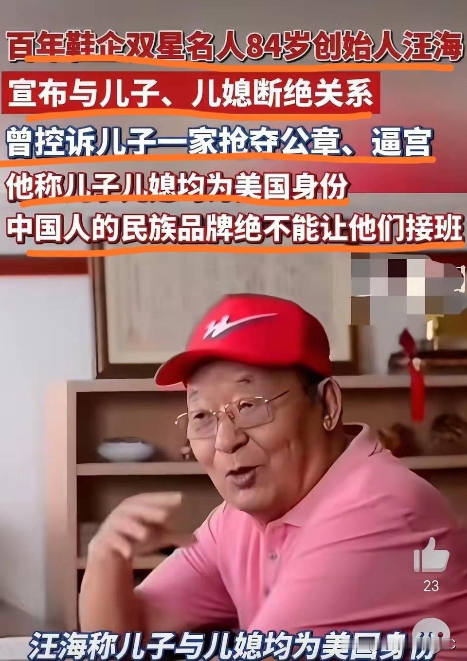 这豪门里的恩怨,真是比那八点档的电视剧还要狗血几分。 84岁的汪海老爷子,硬是跟亲生儿子一家断绝了关系,这魄力真不是一般人能有的。 原来是儿子儿媳动了改国籍的念头,还顺带想接手老爷子打拼了一辈子的民族企业。 汪海是什么人?那是第一批闯出来的实干家,骨子里硬气得很。 他早就定下了“破三铁”的规矩,铁饭碗、铁交椅统统没有,谁行谁上。 公司得交给职业经理人打理,绝不搞“父传子”那套封建世袭。 听说儿子一家连老母亲200多万的养老钱都惦记上了,这吃相未免也太难看了。 老爷子这一手“大义灭亲”做得够绝,但也真让人佩服。 咱东方大国的民族品牌,要是落到外籍子女手里,那才是最大的讽刺。 宁愿把家丑外扬也要守住企业的根,这就是老一辈企业家的脊梁。