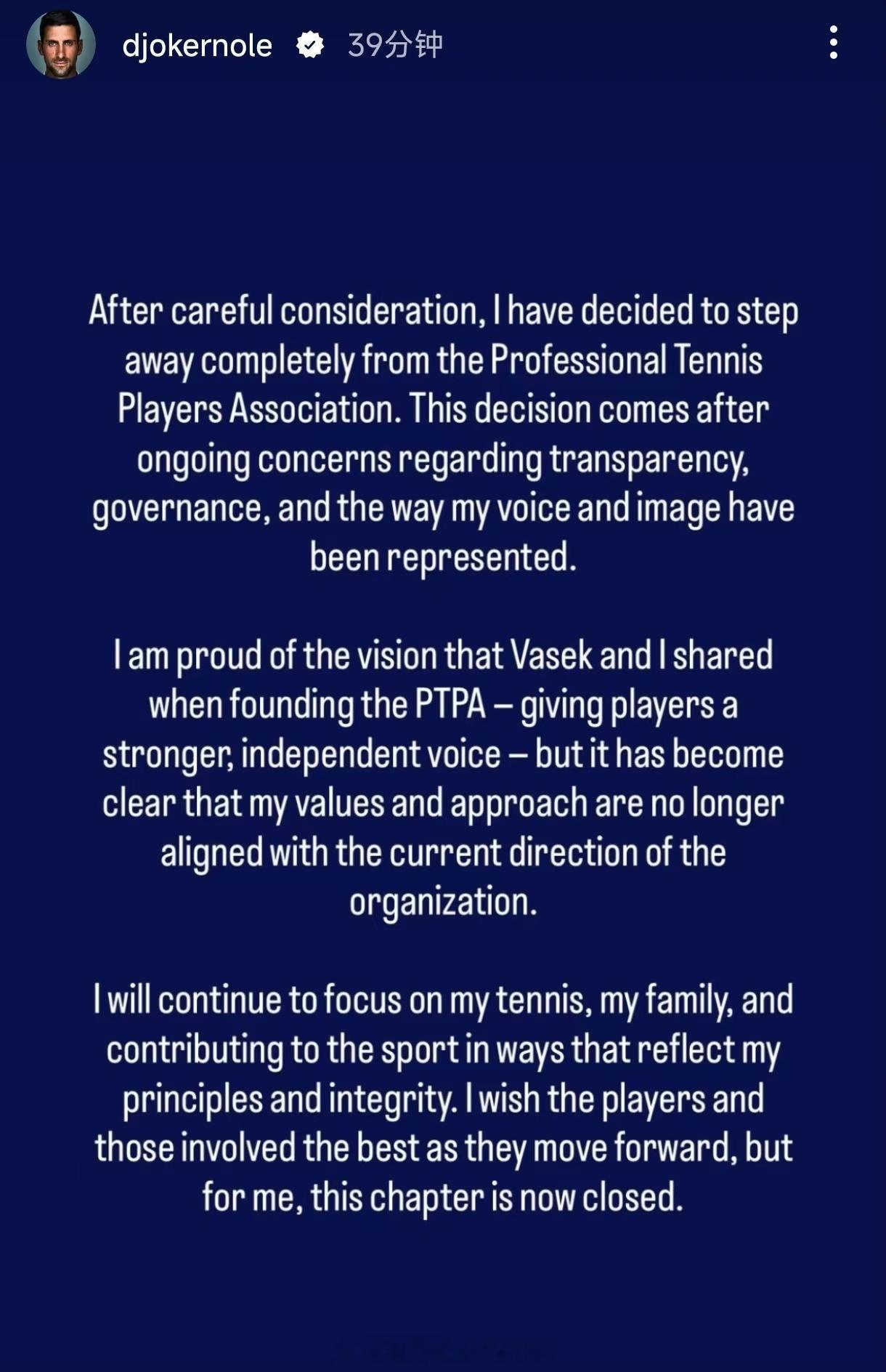 四字点评德约科维奇宣布退出PTPA:“经审慎考虑,我决定完全退出职业网球运动员协会(PTPA)。作出此决定,源于我长期以来对协会透明度、管理运作,以及自身观点与形象被呈现方式的诸多顾虑。瓦塞克(波斯皮希尔)与我当年创立PTPA,初衷是为球员争取更有力、独立的发声渠道,这份初心我始终引以为傲。但如今已明确,我的价值观与行事理念,与协会当前发展方向已不再契合。我将继续专注于网球事业、家人,并以符合自身原则与初心的方式为这项运动贡献力量。祝愿所有球员及相关人士未来一切顺遂,于我而言,这段旅程就此落幕。”体育大赏