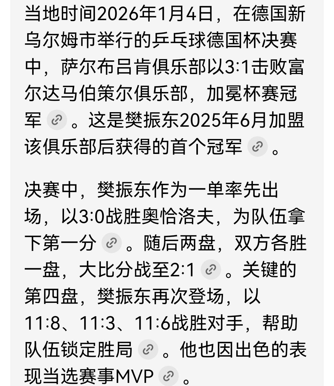 元月5日,德国杯乒乓球决赛结束,樊振东所属俱乐部勇夺冠军。 樊振东在德国集宠爱于一身,颁奖仪式上,俱乐部全员举杯后,每个成员轮番再次举杯庆祝。奖杯由主教练传给队长弗朗西斯卡,队长亲手递给樊振东。是的,大功臣樊振东成为第一个举杯庆祝的人。 对于这么优秀的球员,首次在海外夺冠我们表示祝贺,小胖加油!