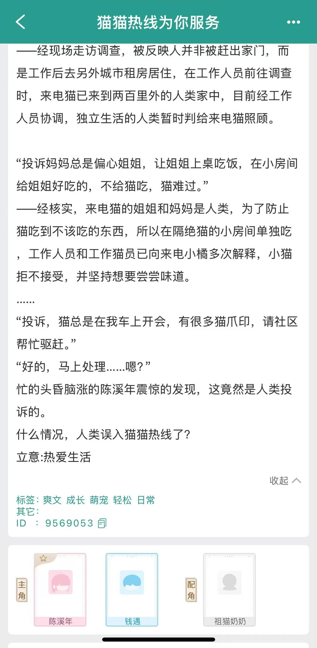 [老虎R]《猫猫热线为你服务》by暮安浅 [老虎R]现言/萌宠/治愈/轻松/日常/慢热/种田文 [种草R]故事以女主入职祖猫奶奶庙之后为起点,用轻松萌趣的单元剧形式,串联起人猫互动故事。作者大大的文笔轻松流畅,语言生动活泼,节奏明快,对猫猫们的形象采用拟人化手法,非常治愈。一句话说,世界不能没有猫猫!!! [种草R]刚毕业的女主在小白猫精的忽悠下,入职祖猫奶奶庙,在入职当天,女主发现庙里除了自己之外,全是猫猫。女主被安装上猫语插件之后,开启了自己的猫猫热线服务。故事用小单元剧的方式,讲述了人与猫猫之间的轻松日常。