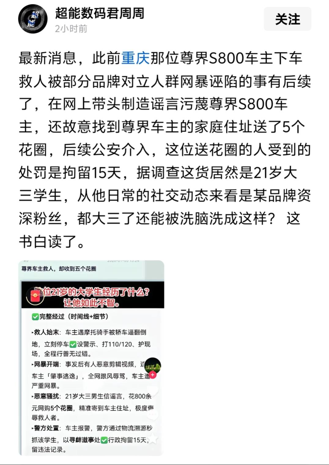 我就奇怪了,这个给尊界车主寄5个花圈的大三男生到底是加入了什么样的网络群,又受到了什么样的洗脑,才会如此的是非不分,才会有这样不顾后果的行为?就因为轻信谣言,就去给素不相识无冤无仇的尊界车主寄花圈,而且一寄就是5个,但凡正常点有点独立思考能力的人都做不出来这样的事情啊!现在自食其果,行政拘留15天,前途渺茫了,这个人生污点将在他以后的就业、考研、出国、落户以及社会征信等等方面留下不可抹掉的负面影响,父母好不容易把他供到了大学三年级,眼看着就要出去实习了,搞这么大件事,哪个用人单位敢让他加入啊!父母该有多痛心和失望? 行政拘留记录虽然不是刑事犯罪记录,不会像案底那样产生终身的极端影响,但在需要政审、背景调查的场景中,负面影响是十分显著的,可以说,这个男生往后想考公考编,进入国企,从事教师、律师、公证员等需要执业资格的行业,资格审核的门槛都难通过,更别说报考军校、警校等特殊院校了,想参与研究生、选调生考试,也一样会面临政审问题,这个违法记录会成为重要负面因素,导致他的录取受阻。 可怜天下父母心,父母辛苦十几年供孩子读大学,盼的是他学有所成、自食其力,堂堂正正做人,结果却因为一时的糊涂留下违法记录。这不仅是这个男生的个人教训,也折射出部分家庭教育和校园教育中,对学生网络素养和法律常识的普及还存在短板。 这件事也暴露了网络谣言和网络群体情绪的可怕之处。恶意剪辑的视频、跟风的网暴言论,像一把把尖刀刺向救人的车主,也把涉世未深的大学生推向了违法的边缘。网络不是法外之地,那些恶意造谣、煽动对立的人,同样应该被追究责任。华为入局智驾的鲶鱼效应 尊界 尊界S800 尊界汽车 尊界豪华体验 尊界销量 鸿蒙智行