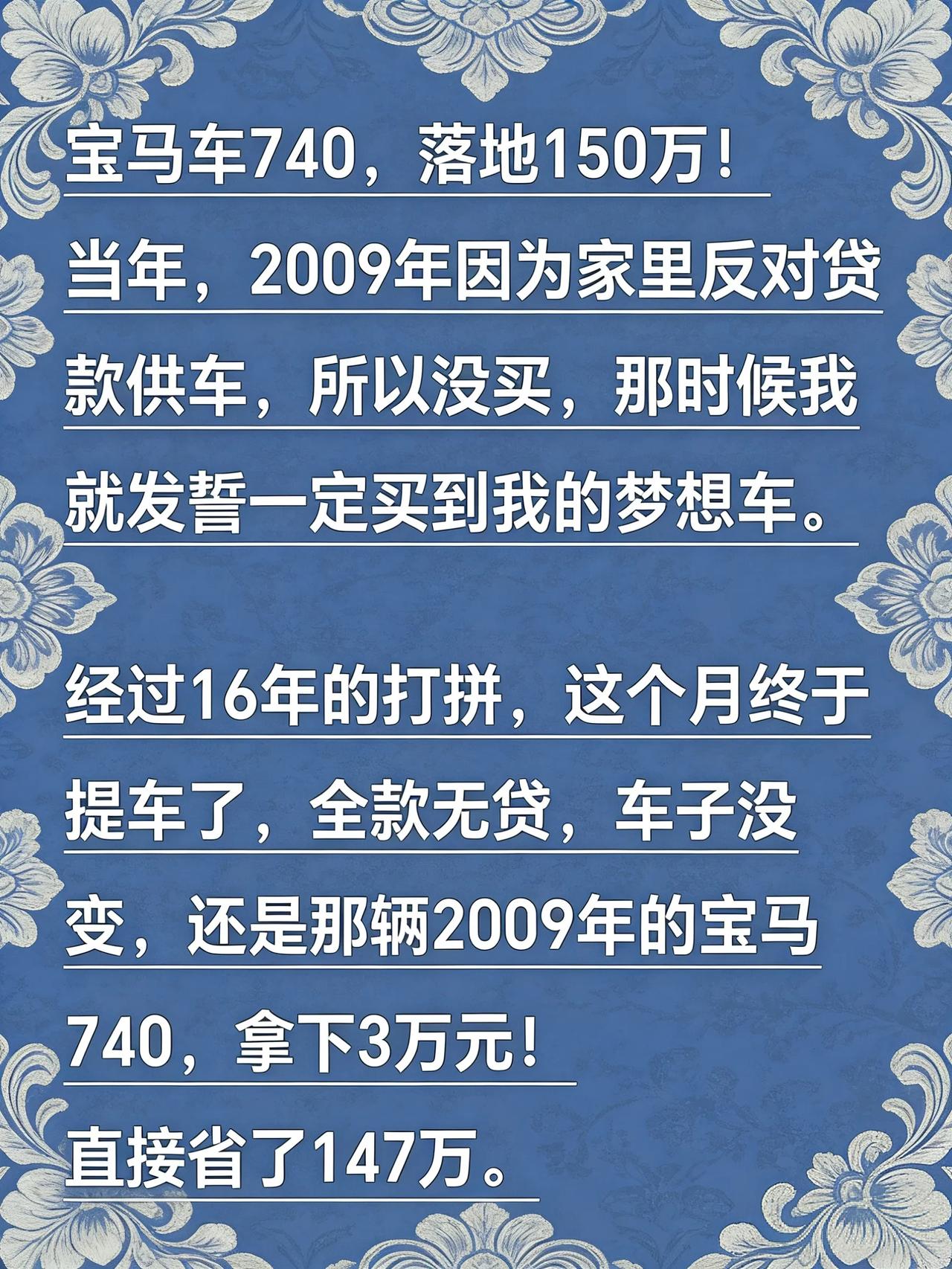 这哥们数学没学好! 2009年宝马740,落地150万!但当年他家里反对他贷款供车,所以他当时就没买,但他在那时候立志要一定买到这车! 经过16年的打拼,时间来到了2025年,他终于得偿所愿了,全款拿下梦里都想拥有的车,仅花费了3万元!他说直接省了147万。 那么问题来了,他说省了147万对吗?别的不说,16年最起码省了20万油费吧!买车才花3万,倒赚了17万!省了有164万。