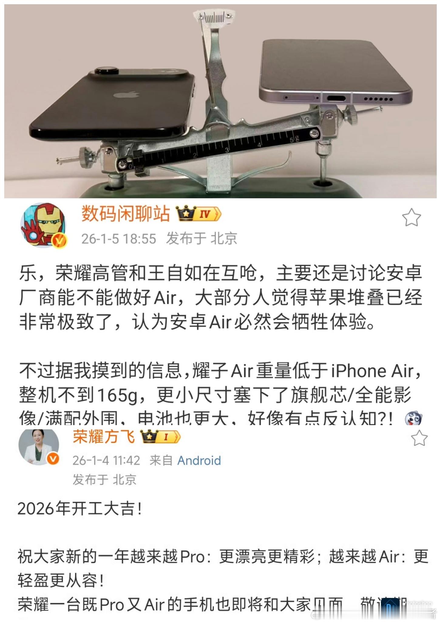 王自如说不相信安卓可以做出比苹果更好的Air;荣耀高管回应说安卓Air分为荣耀和其它,谁说的更有道理?看这个爆料,荣耀Air的重量比iPhone Air还要轻。已知,iPhone Air重量165g,厚度5.64mm;那荣耀Air的重量就值得探讨了。消息称,荣耀Air在轻薄机身设计之下,给了旗舰芯片、给了全能影像和满配的外围配置,电池也更大。如果真的是这样,那的确是安卓Air阵营唯一的旗舰产品,其它Air品类都是性能和外围有缩水。
