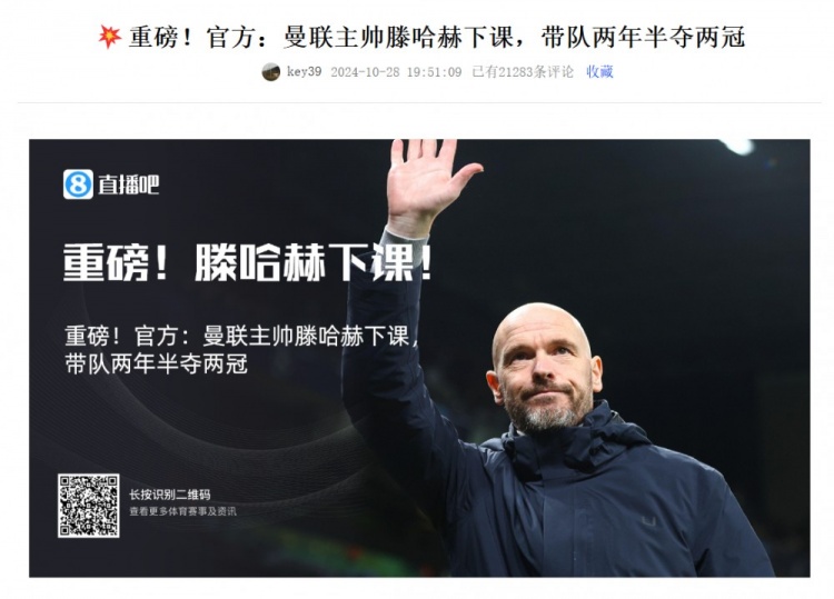 但与前任——“流量祖师爷”滕哈赫相比,阿莫林还是稍显逊色。在滕哈赫下课官宣2小时后,当时评论已经超过2.1万条。