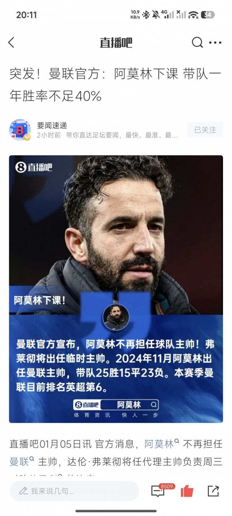 直播吧1月5日讯曼联官方重磅宣布,阿莫林下课!自下课官宣以来,2个小时已有8500条评论。