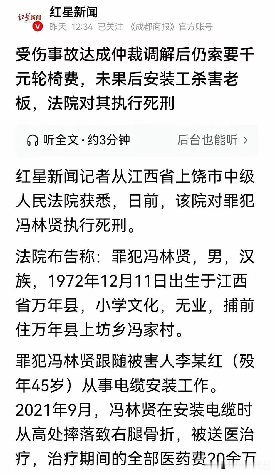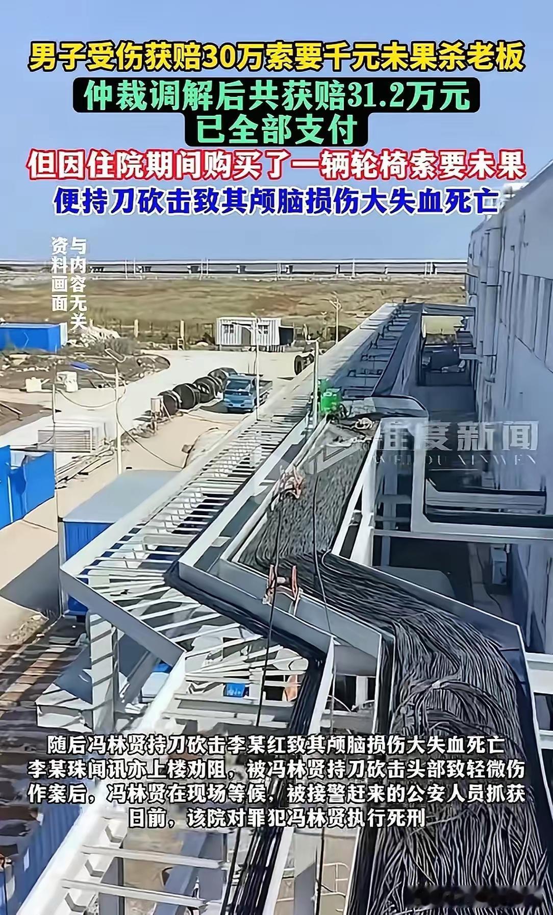 这起案件令人深感痛心和警醒。事件从工伤事故到最终的悲剧,暴露了多方面的问题,也反映出一些社会和法律层面亟待关注和改进的地方。 一、事件回顾与法律分析 工伤赔偿与协议履行 冯某在工伤中得到的赔偿(30多万元)以及事后双方达成的调解协议,法律上讲,基本已对事故责任进行了消除。根据相关法律,合理的赔偿应覆盖因伤导致的各种损失,包括医疗费、辅助器具等。签订协议意味着双方已达成最终解决方案,后续索赔要受到法律限制。 轮椅费用的法律地位 冯某曾花599元购买轮椅,若该轮椅是因伤发制造的必要辅助器具,根据司法解释,应属于合理的赔偿范围,但最终调解协议中一般会考虑已包括此类合理费用。因此,冯某事后再次索要轮椅费,没有法律依据,属于无理取闹。 冯某杀人行为的法律后果 冯某因多次纠缠未果,带刀行凶,导致一死一伤,构成故意杀人罪,依法应追究刑事责任。我国刑法明确规定,故意杀人可判处死刑。法院依法判决,体现法律的严肃性与公正性。 二、案件中的深层次问题 责任界限与善意解决 老板李某在工伤后积极配合赔偿,展现了应有的善意和责任感。然而,企业责任和个人赔偿与受害者的个人情感、心理状态往往难以平衡。一旦出现赔偿矛盾,部分受害者存有索取过多或不合理的期待,可能引发极端事件。 社会心理与法律意识 冯某三年来的不满、埋怨、以及最终的极端行为,反映出心理疏导和法律教育的重要性。社会应强化对工伤受害者的心理支持和法律教育,帮助他们正确解决矛盾。 预防极端事件的措施 事发前,或许可以通过调解、心理疏导等手段缓解冯某的情绪,避免事态升级。警方和相关部门应加强针对潜在极端行为的监测与干预。 三、对社会的启示 法律至上,依法理性维权 受害者及其家属应通过法律途径维护权益,避免情绪化、极端化行为。 企业责任应明确和履行 企业在安全生产和善后工作中应尽责、及时沟通妥善解决内心矛盾。 完善心理疏导与社会支持 为受伤者提供专业心理指导和帮助,减少因心理压力引发的极端行为。 总结 这是一场悲剧,也是一面镜子。我们应共同努力,完善法律制度,加强心理疏导,提高公众法律意识,防止类似事件再度发生。唯有如此,社会才能变得更加安全、和谐。 如果你需要更深入的法律解读或相关建议,也可以告诉我。职工工伤认定 工伤流程