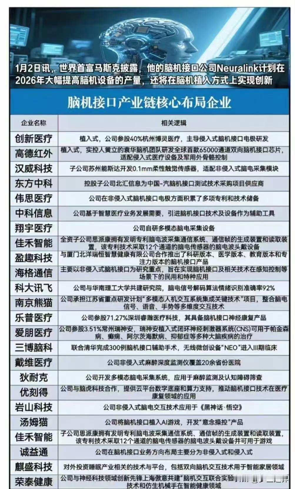 2026:脑机接口,从科幻到现实的跨越 曾是科幻电影里的想象,如今在2026年,脑机接口(BCI)正迎来从“实验室”到“生产线”的关键转折。 一、 产业加速,双轮驱动 今年被视为BCI的“产业元年”。马斯克的Neuralink计划2026年大规模量产,手术将实现自动化。国内方面,BCI已纳入高端医疗器械优先审批通道,工信部等七部门明确目标:2027年关键技术突破,2030年生态成型。 二、 技术落地,三条路线 ① 侵入式:精度最高。国内企业如脑虎科技已推出全植入无线产品,助力重度患者。 ② 半侵入式:平衡之选。清华大学团队利用此技术,已帮助高位截瘫患者恢复运动功能。 ③ 非侵入式:安全普及。无需手术,通过穿戴设备即可实现,已广泛应用于孤独症评估、专注力训练等日常场景。 三、 应用前景,改变生活 在医疗领域,它为渐冻症、瘫痪患者带来“重生”的希望,也为癫痫、帕金森等疾病提供精准治疗方案。在未来生活里,意念控制智能家居、VR/AR交互等场景也指日可待。 结语 2026年,脑机接口正从梦想照进现实。这不仅是技术的飞跃,更是人类探索生命、改善生活的全新起点。让我们共同期待这项技术带来的美好未来!