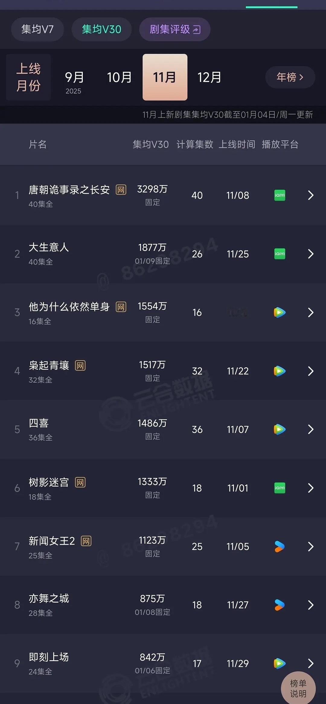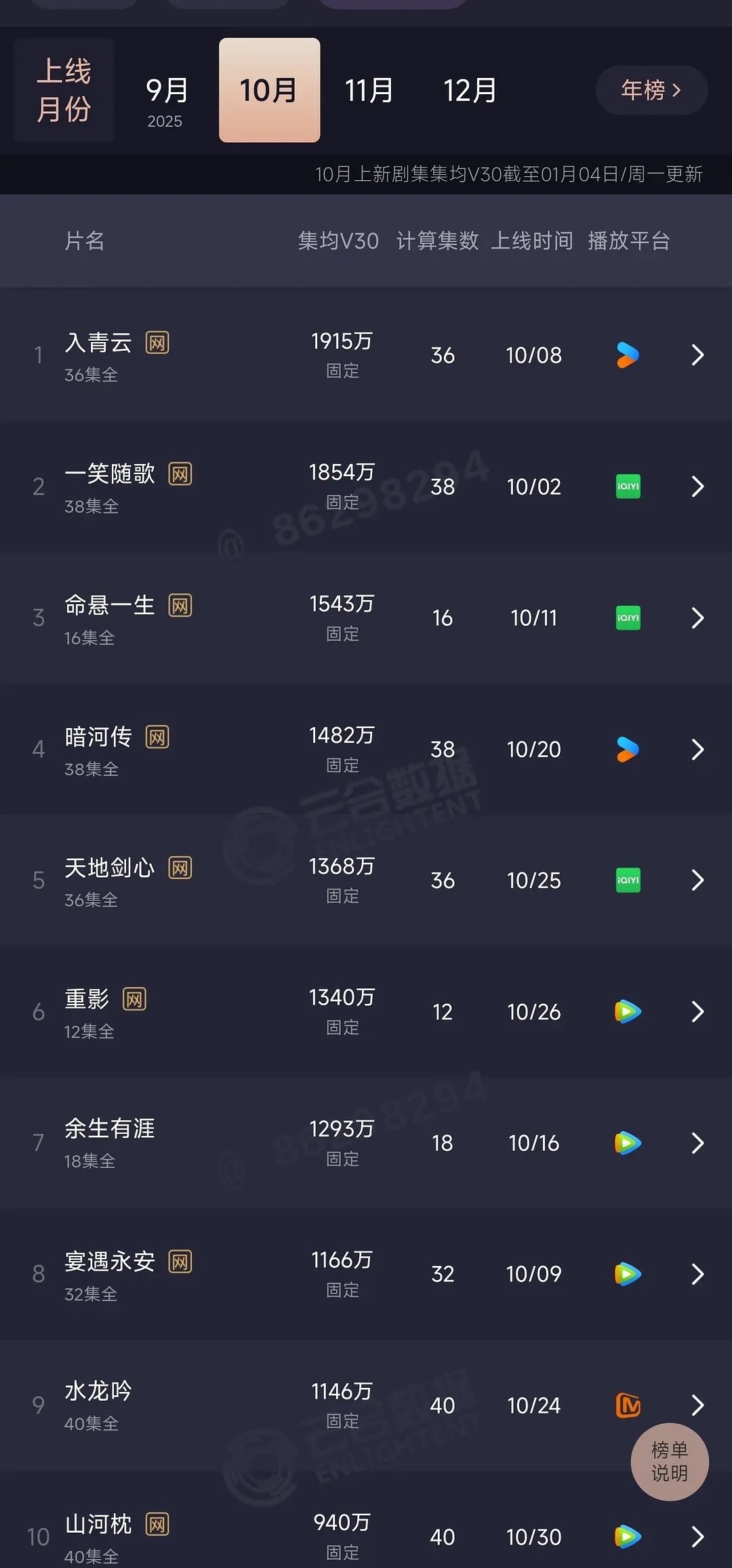 10月11月云合出来了,现在长剧是真的没人看了,迪丽热巴的枭起青壤集均1500出头,不如七根心简,真的让人意外,暗河传我体感挺热的,没到1500,天地剑心我体感也挺热的,也没到1500,芒果的水龙吟1100,也不高,现在1500都算不错了,真的太可怕了。