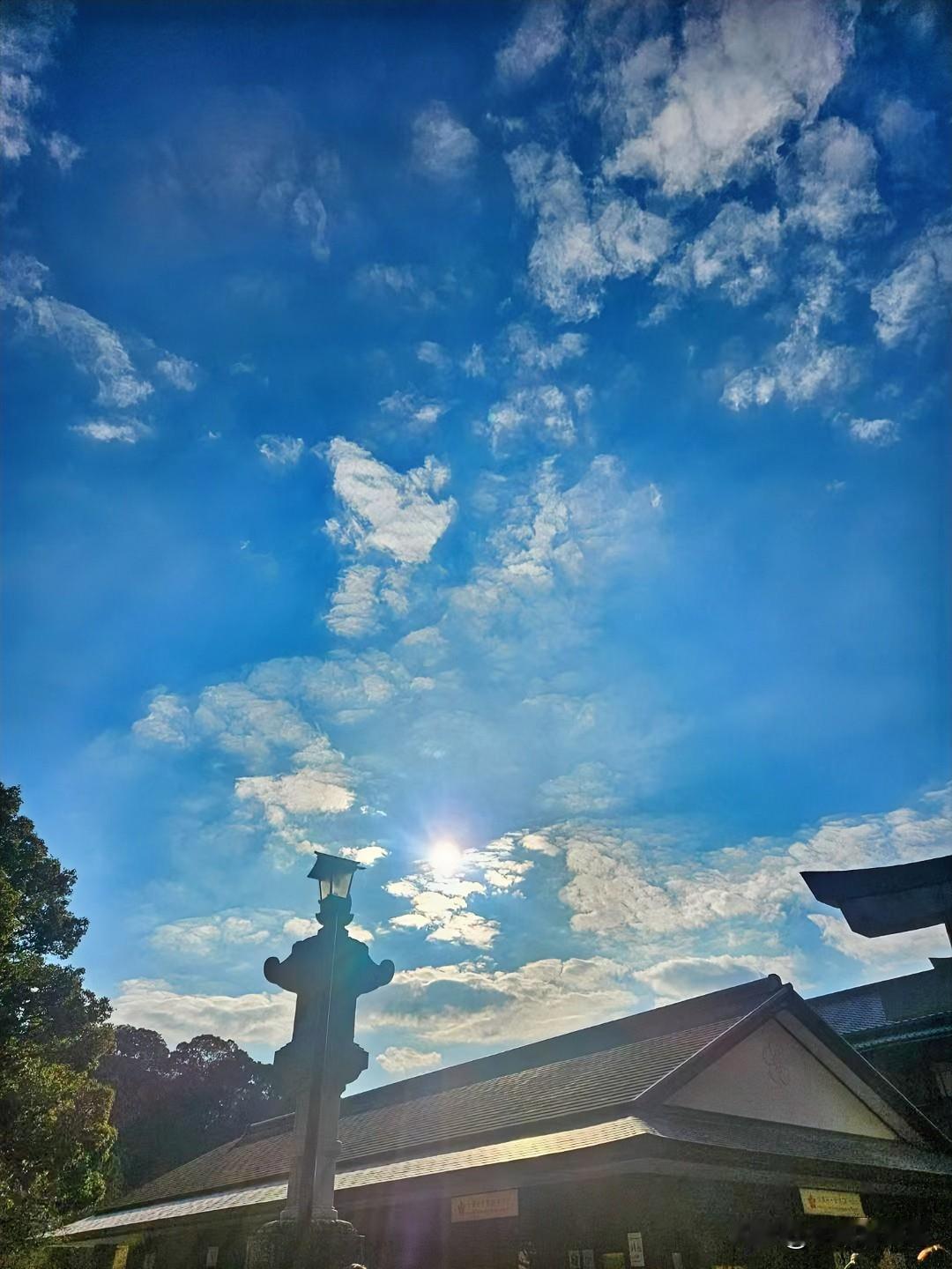 随手拍了张天空照,这蓝天也太绝了! 太阳明晃晃地挂在中间,光线亮得有点晃眼,却又不觉得燥得慌。天上飘着的云不是那种厚墩墩的,是一丝丝、一片片的絮状云,像被谁随手撒在蓝布上的棉絮,稀稀拉拉的,衬得天空更蓝了。 底下能看到日式屋顶的檐角,还有个造型复古的灯柱,树影也黑黢黢的衬在旁边。风一吹,树叶轻轻晃,抬头看天的那一刻,啥烦心事都没了,就觉得日子慢悠悠的,特舒服。这随手抓的美好,比精修的照片还戳人。