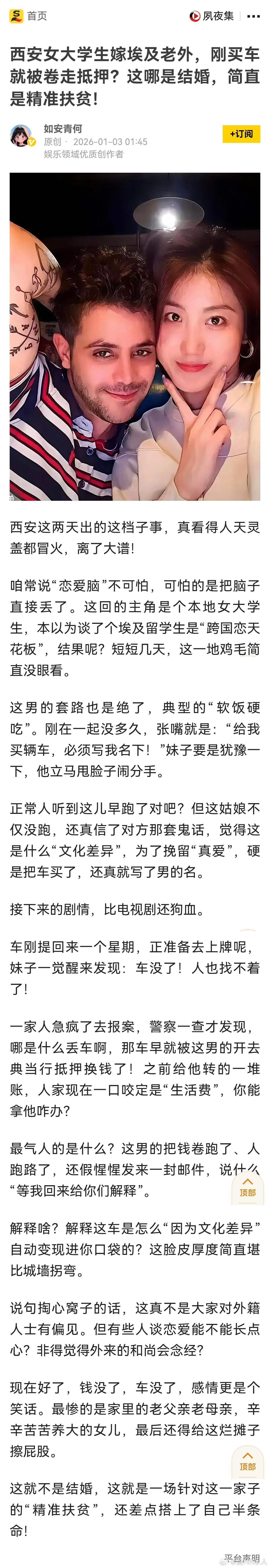 西安女大学生嫁埃及老外,刚买车就被卷走抵押?这哪是结婚,简直是精准扶贫!我们在这一点的教育是有巨大问题的,亚非拉国家90%人均GDP都是不如中国的,基本上100%人均生活不如中国。那么为什么嫁这么差还认为嫁得光荣,被诈骗也是自找的。再说一次,亚非拉有钱家庭首选留学是美国,其次欧洲。到中国基本都是靠中国奖学金的中下层家庭。嫁他们就是去受苦的。