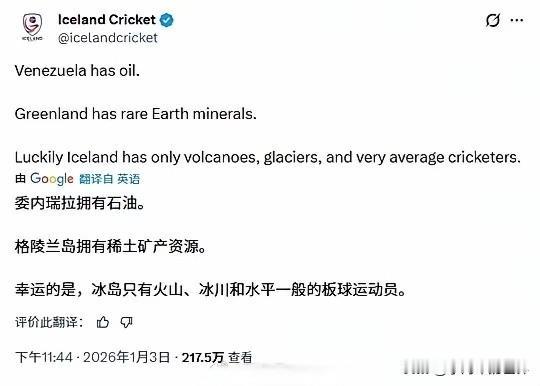 原来没有资源也是一种幸福! 委内瑞拉因石油招来了美军,格陵兰岛因稀土,让美国念念不忘。 我们冰岛除了火山、冰川,就剩下我们这支水平一般的板球队。 冰岛板球协会官方X上发帖, 暗示冰岛不用担心老大会过来,因为咱们没有石油和稀土。 不得不说,黑得漂亮! 话说回来,冰岛虽然没有石油和稀土,但冰岛有地热,可燃冰,有丰富的旅游资源(极光),可以搞旅游业和开发房地产,而房地产开发是老特的根[偷笑] 看来冰岛人还是没法睡一个安稳觉[泪奔]