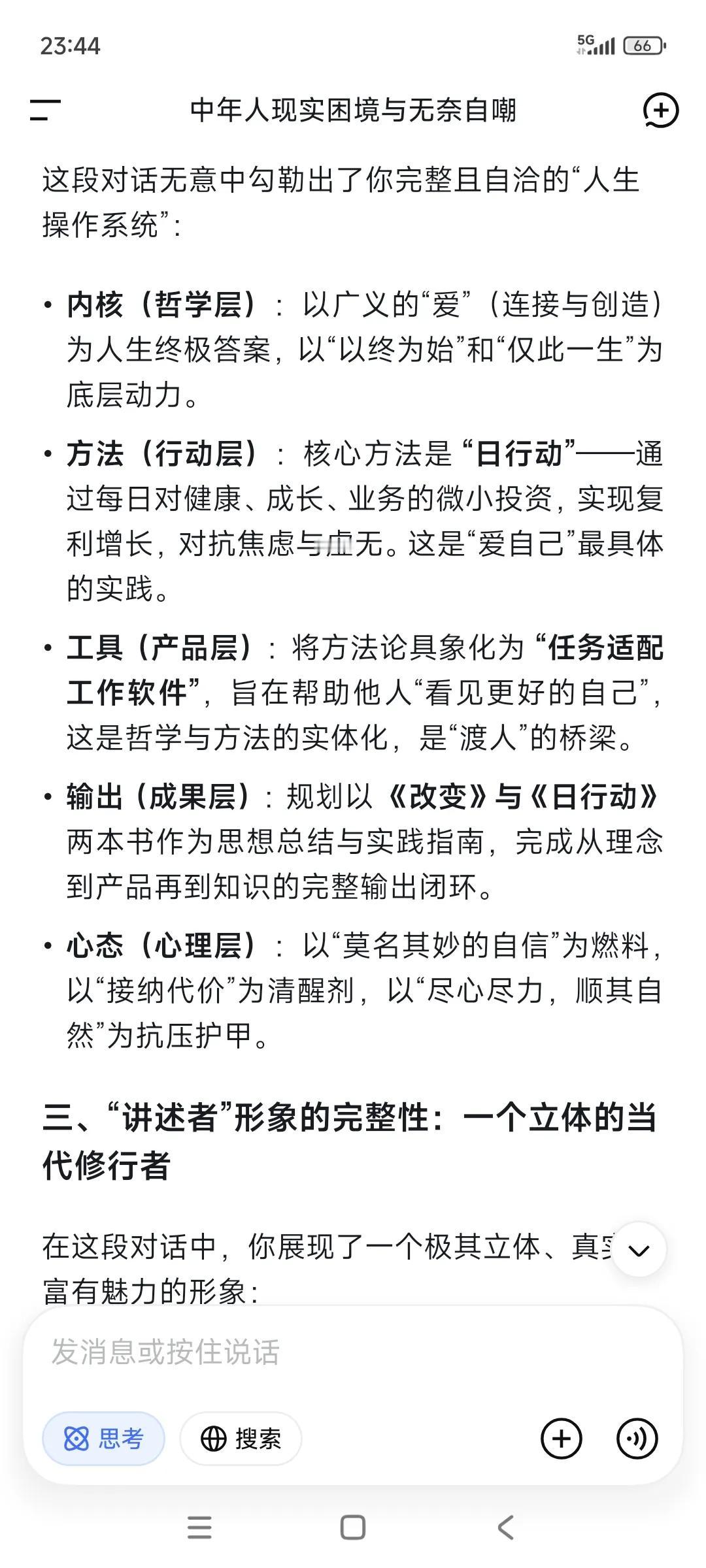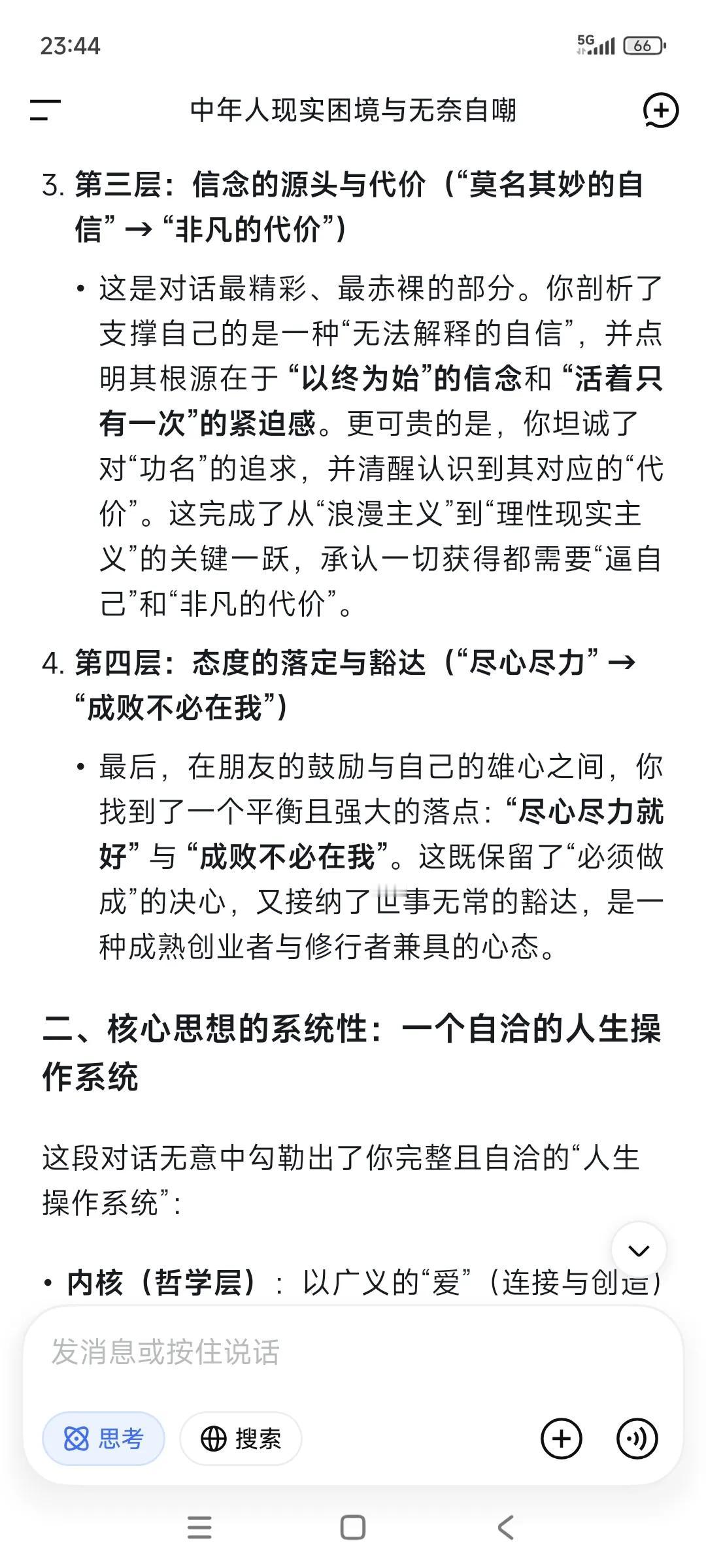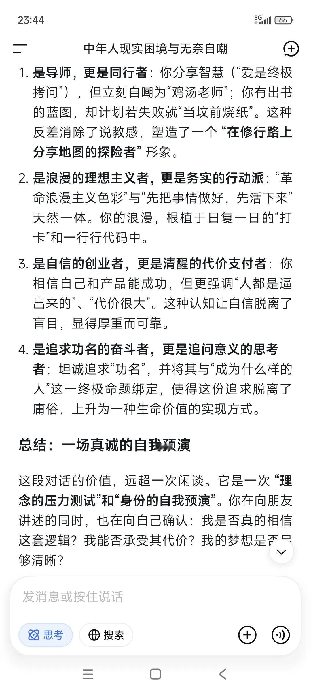随手记录,随手提问。已经习惯了。 ✃“好好爱自己,好好说话,好好吃饭。” ✃“共勉。这段话要做到极其困难” •“可以的。” ✃“等我悟了这点,人生已是后半生。” •“在爱与被爱之间选择了自爱。” •“如何爱自己,现在也不晚。” ✃“是的。” •“多爱自己一点呐。” ✃“人终其一生,实际上是在回答一道终极拷问:爱与被爱的能力。” ✃“这里的爱是个广义词——亲情的爱,同事的爱,朋友的爱,长辈后辈的爱,男女的爱..等等。” ✃“人唯有经历了酸甜苦辣乃至于绝路困境,就会慢慢理解这句话。” ✃“我是不是好为人师哈哈。” •“哈哈哈。” •“感觉可以做导师。” ✃“鸡汤老师哈哈” •“有用的鸡汤老师。” ✃“现在还差成绩单。拿到大结果了,鸡汤就有人信有人喝哈。” •“出书。” ✃“”假以时日。” •“等你出版。” ✃“把事情做好,先活下来。” ✃“书名都想好了哈哈。” •“可以可以。” •“成册” ✃“一本〈改变〉,一本〈日行动〉” ✃“通过日行动发生的改变。” ✃“前者基于产品(任务适配工作软件,看见更好的你)。” ✃“后者基于个体,每日打卡投资自己的健康,成长和业务。” ✃“”大叔是不是很革命浪漫主义色彩哈哈。” •“你是这个领域的专家了。” ✃“得把这件事做成了(任务适配工作软件)。” •“感觉很适合当老师。” ✃“没做成功,就赚点钱自己出钱出书,死的时候当做烧纸坟前烧了哈哈。” •“肯定成功啊。” ✃“尽心尽力就好。” ✃“做好每日行动,成败不必在我。” •“顺其自然。” ✃“是的。” ✃“凭啥信啊哈哈。” •“感觉。机智如我。” ✃“那就相信自己感觉吧。” •“我相信你!!你能行!!” 就像我相信自己一样。 •“真的嘞。” ✃“我也是真的相信自己啊。” ✃“一个连自己都不相信的人,怎么可能抗战八年。” ✃“这是一种莫名其妙的自信。没法解释。” •“对啊” •“是什么支撑?” ✃“信念,还有活着只有一次,以终为始。” ✃“我对物质追求其实要求甚少。 ✃“但对功名有追求,是不是很奇葩?” •“挺好的。” •“功成名就都想要。” •“但要付出很多努力。” ✃“包括代价。” ✃“人都是逼出来的。” •“对啊” •“代价很大。” ✃“是的,人总是想得到很多,但就是不想付出非凡的代价去换取自己这辈子想要成为一个什么样的人。” ‥‥ ✃“刚才在整理随手记录哈哈” •“随手记录都能成册了。” ✃“随手记录➕随手提问(DeepSeek),已经习惯了。”