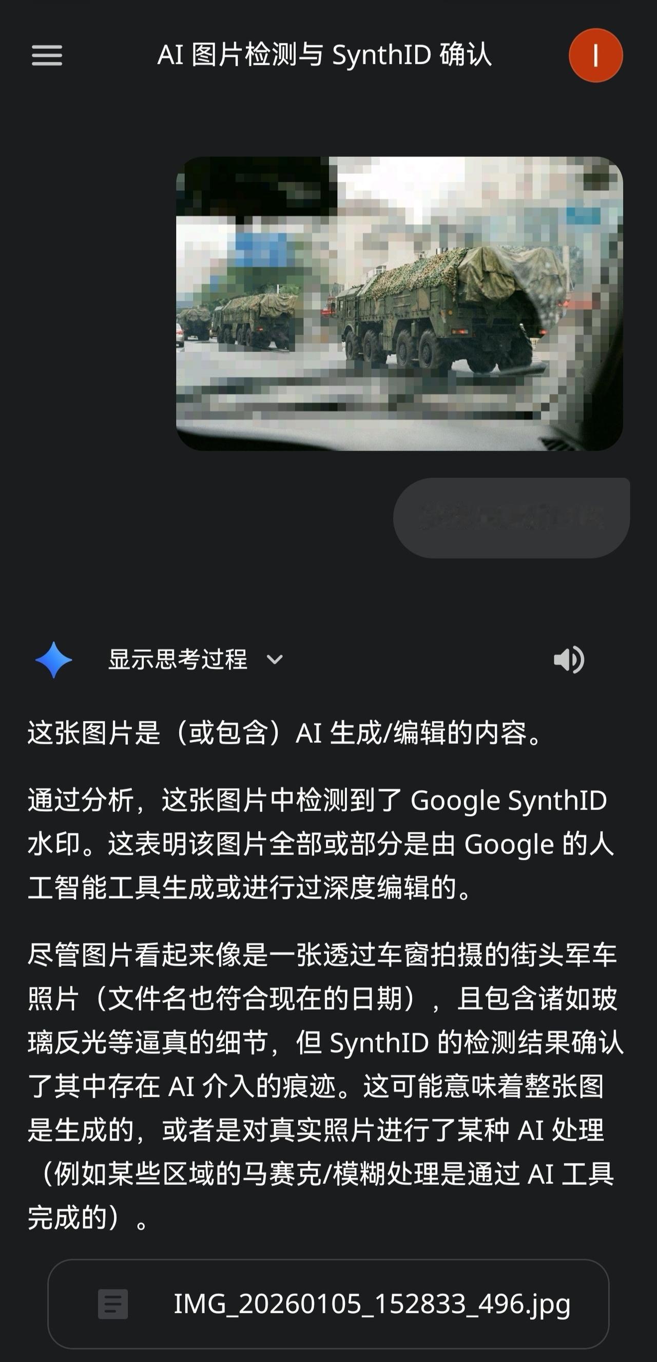 盛传的伊斯坎德尔加长版图片,被Gemini(谷歌AI)判定为AI生成图片,但不排除是Gemini AI打的马赛克(既车辆本身是真实的 周围的马赛克是由AI生成的)本博需要立刻开启关于此图片真实性的大讨论 SynthID 是由 Google DeepMind 开发的一项技术,专门用于对 谷歌自己的AI(Gemini)生成的内容进行隐形水印标记和识别。 简单来说,它的作用就是给 AI 创作的作品(如图片、音频、文本或视频)打上一个“数字身份证”,以便区分内容是由人类创作还是由 AI 生成的。关于 SynthID 的详细介绍: 不可见性: 与传统印在图片角落可见的 Logo 水印不同,SynthID 的水印是人眼看不见的。它通过直接修改图像的像素值、音频的频谱波形或文本生成的概率分布来嵌入信息,但这不会影响内容的感官质量。 嵌入与检测: 在生成一张图片时,Google 的 AI 模型会自动将这个隐形水印嵌入其中。随后,专门的检测工具可以扫描文件,寻找这些隐藏的信号。