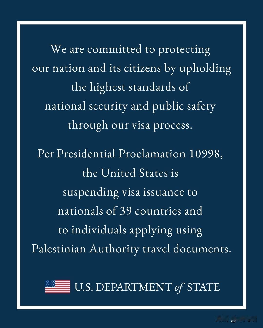 根据第10998号总统公告,自2026年1月1日起,美国将全部或部分暂停向39个国家的国民以及使用巴勒斯坦权力机构签发或认可的旅行证件申请签证的个人发放签证。