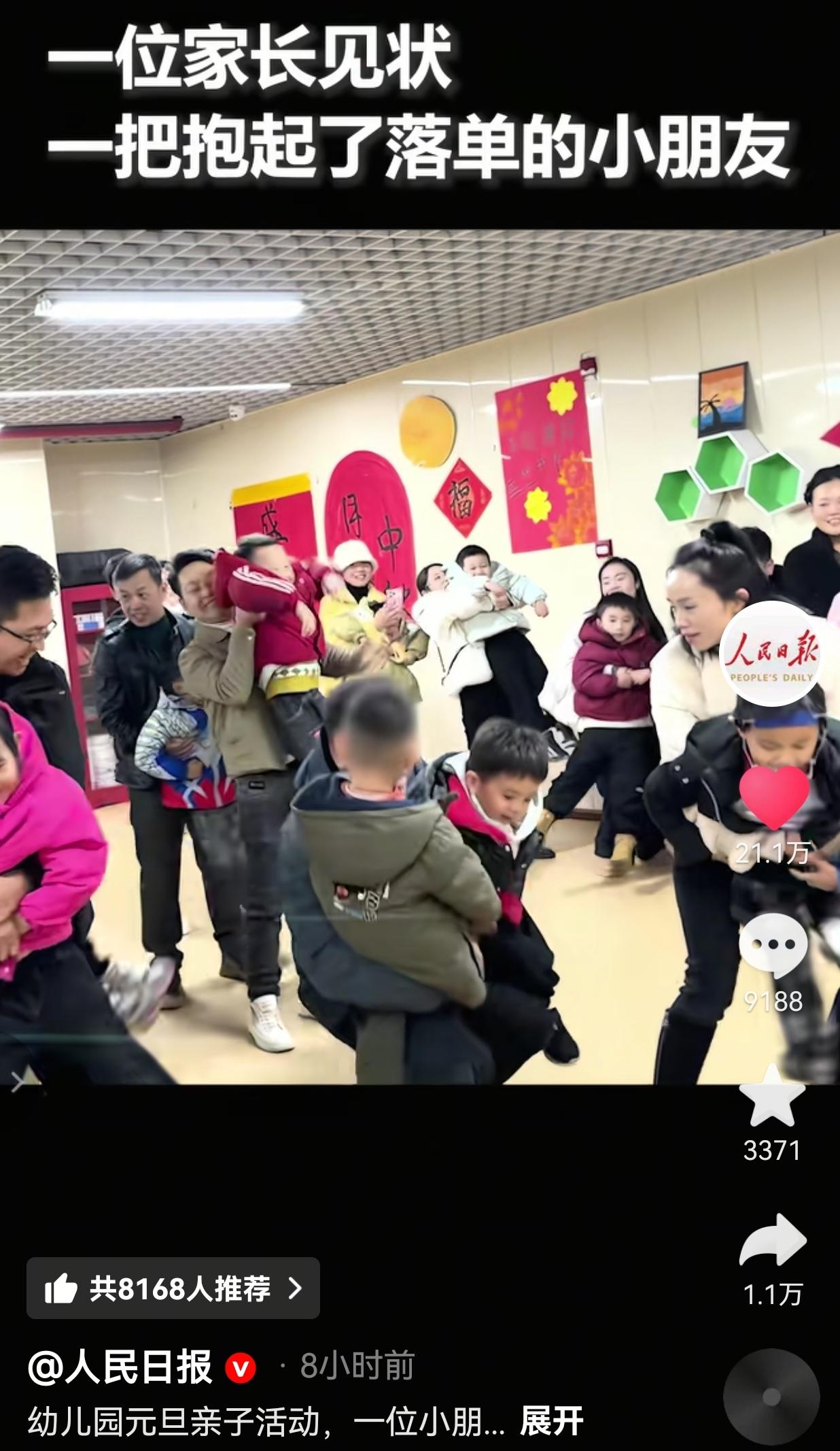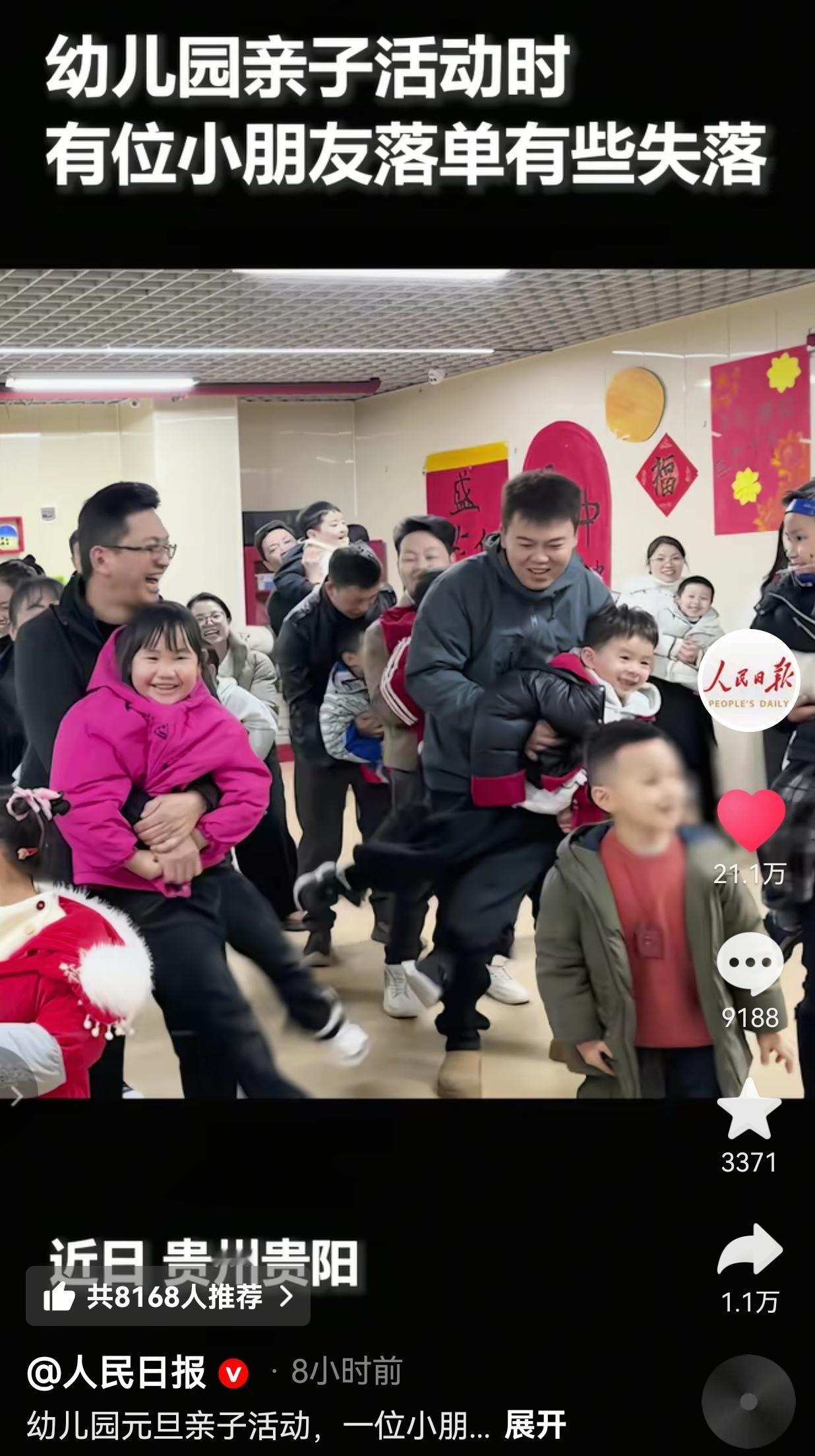 上人民日报了!近日,贵州贵阳一幼儿园在举办亲子活动时,其他的小朋友都有家长陪伴,一起做活动,玩的很是开心。可是,有一位小朋友孤零零地站在一旁,略显尴尬,不知所措,显得有点格格不入。 视频中,可以看的出来,他一直用渴望的眼神,注视着各位小朋友和家长,或许,这一刻他多么希望,父母也能出席亲子活动呀! 好在正当他不知所措的时候,一位小朋友的家长注意到了他,思虑再三,还是把将落单的孩子抱了起来。 这位落单的小朋友被抱起来之后从满脸的不开心到喜笑颜开,看得出来,他真的渴望得到来自别人的关爱。 事后,幼儿园知道了这一情况,还特意向这位暖心的爸爸送了一面锦旗。 据知情人介绍,这位落单的孩子跟爷爷奶奶一起生活,由于爷爷奶奶年纪大了,不太懂得游戏规则,所以,就没有陪孩子参加游戏。 网友看到后评论说:“虽然只是一个小小的举动,可是就是这个善意的举动,足以温暖孩子的整个童年。” 还有的网友说:“我想所有的家长都愿意这样做,为什么一开始没有做呢?那是因为,家长也有点不好意思,会觉得是否冒昧,你看这位家长看了这个孩子很久,后面决定抱起来的时候这位家长肯定也付出了巨大的勇气。” 如果这个落单的孩子,在这场亲子游戏中,一直是个小透明,没有机会参与亲子游戏,他肯定心里不开心,会对孩子的成长产生不利的影响。 而这位爸爸的举动,看似微不足道,却托起了一个小朋友温暖的童年。 当然了,我们在这里也要提一嘴落单同学的父母,可能你们为了生活在外拼搏。可是,你们也要知道,孩子的成长只有一次,错过了就真的错过了。 而且,像这种情况,就算你们来不了,也要给孩子安排好亲自活动,比如让家里的其他成员参加,让孩子不要落单,否则,真的会让孩子感觉,没有什么安全感。 严重的话,他可能会觉得自己是一个不受父母宠爱的小孩,这对孩子的成长极为不利。 大家觉得呢?欢迎大家评论区讨论留言。