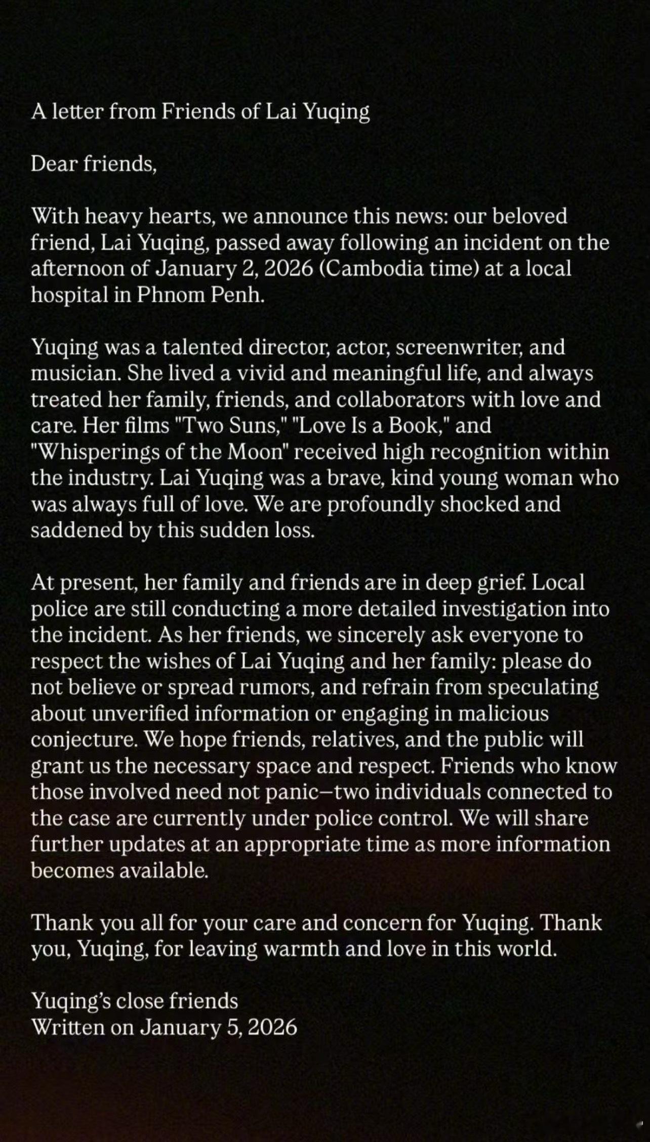 23岁青年导演赖宇晴在柬埔寨金边不幸逝世,她执导的电影《潮汐低语》曾入围2025